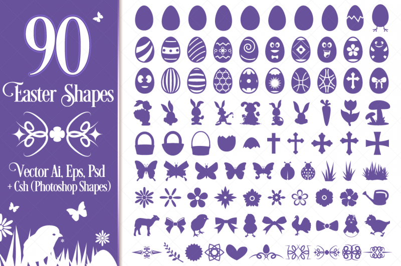 90 Easter Vector Shapes: simple eggs shapes, eggs with decorations, bunny, carrot, tulip, mushroom, basket, cross, butterfly, grass, ladybug, flowers, lamb, chicken, dove, bow, and other decorations. Format: Ai, Eps, PSD, CSH (Photoshop Custom Shapes). Great for Easter and Spring projects where you need some quick shapes 🙂