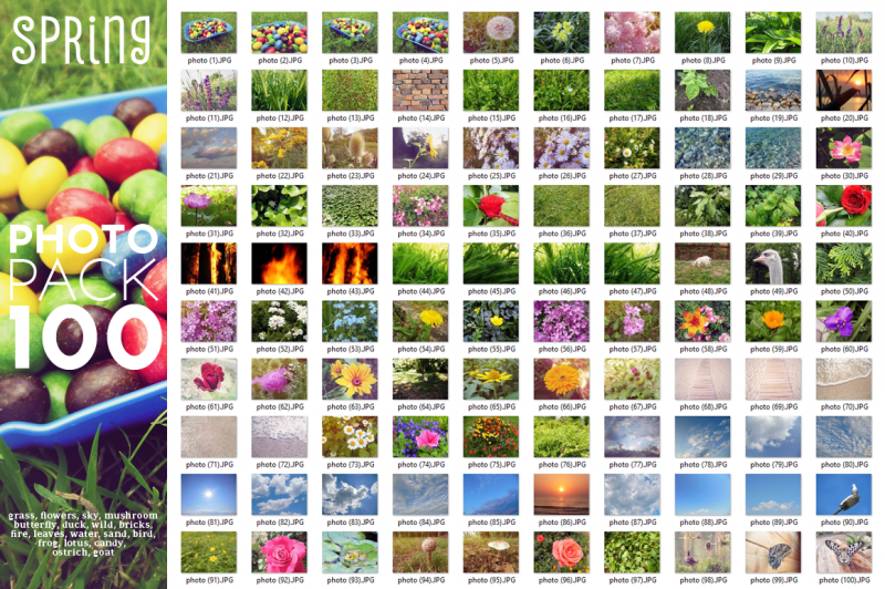 A set of 100 Photos 3000x2250px 300ppi. Contain Photos Like: colored candy, grass images, wild flowers, water, sand, bricks, clouds, sky, bird, frog, butterfly, mushroom, ostrich, goat, duck…