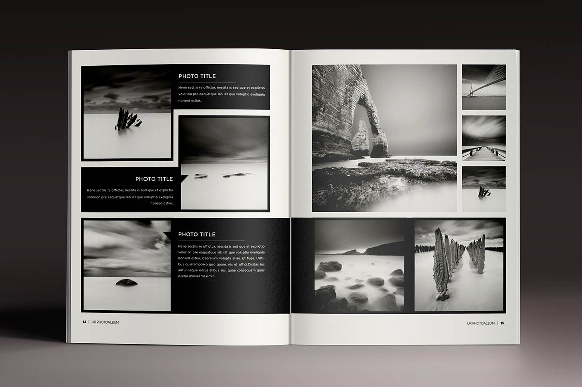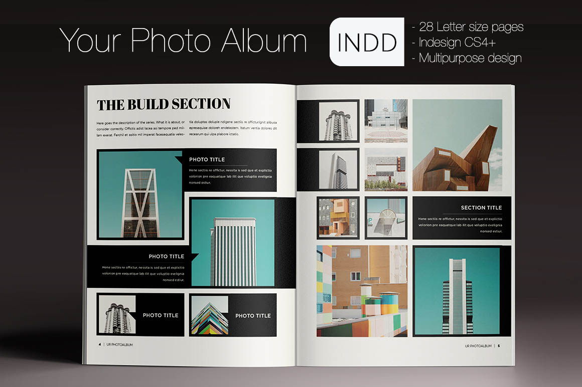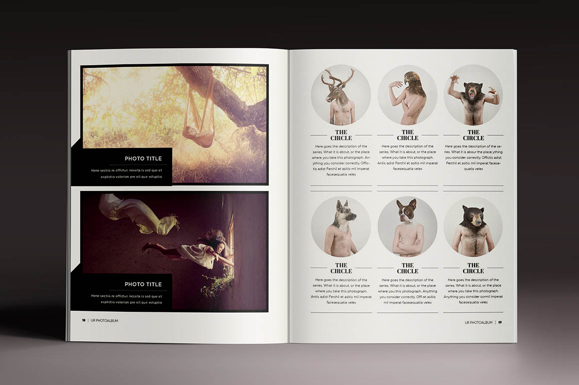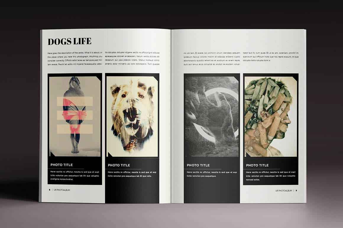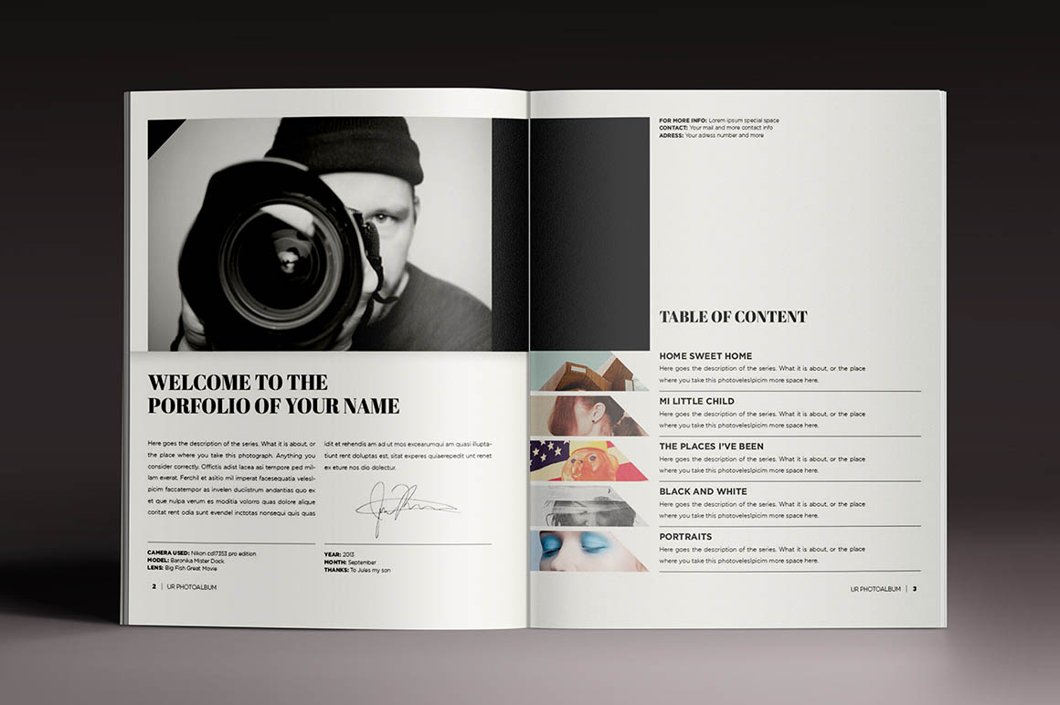 This template is perfect for designers, photographers or graphic artist! This professional photo album will reflect the high standard of your work. Its very easy to add your own work and text. Also, if you want to make it longer, you can easily add more pages… 28 Pages, print ready, letter size. All the font used are inside “Help file”