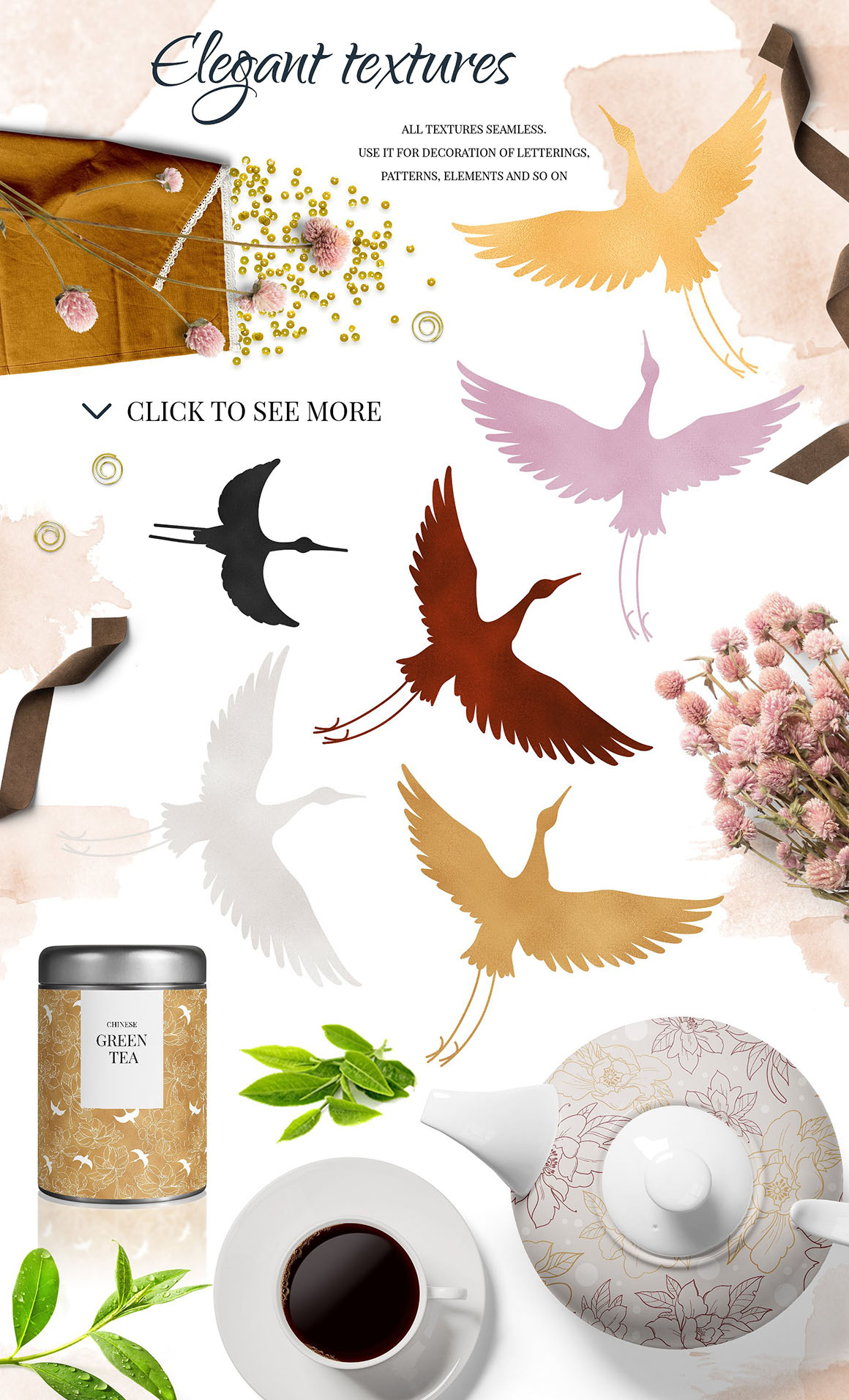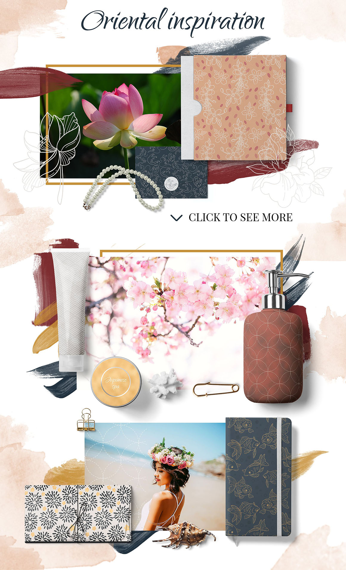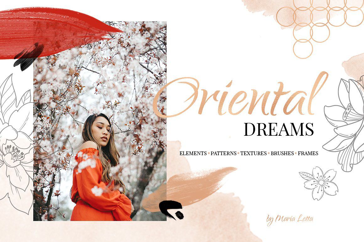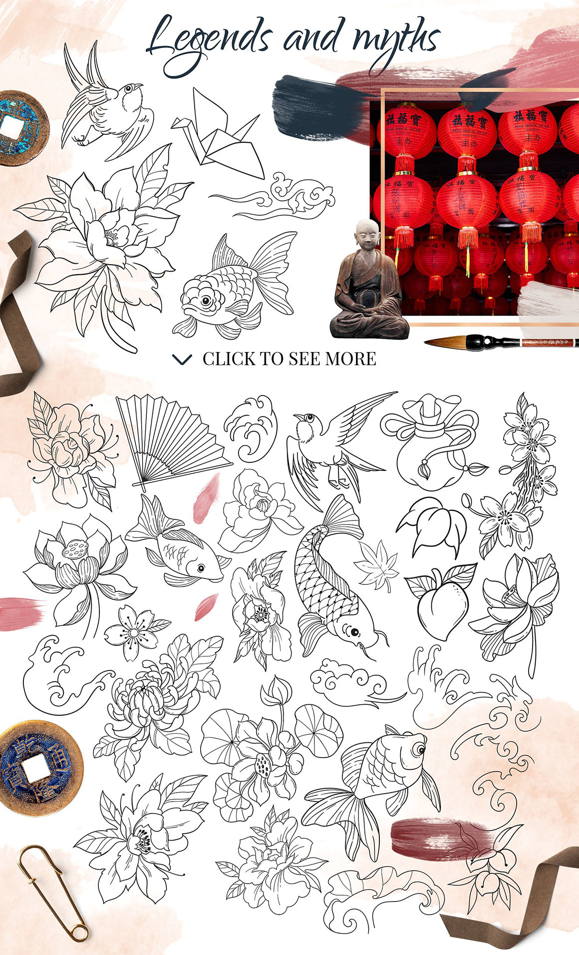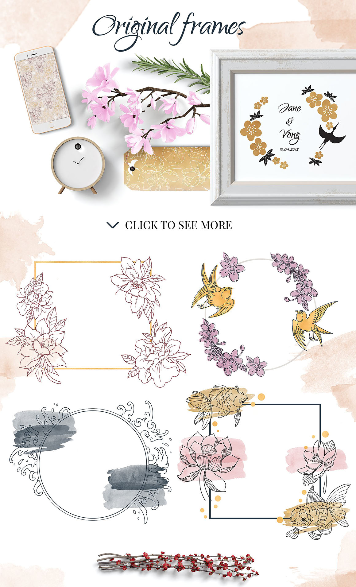 Elegant and aesthetic oriental collection will help make your design awesome. I was inspired classic Chinese and Japanese culture but in modern style. Each element has a value, for example fish is a symbol of wealth, lotus is a symbol of purity and wisdom, so your design will be full of auspicious meaning. All what you need for creation here – elements (contour and small additional), patterns, textures, brushes and frames. Ideal for wedding design in oriental style, social media, poscards, branding and so on.