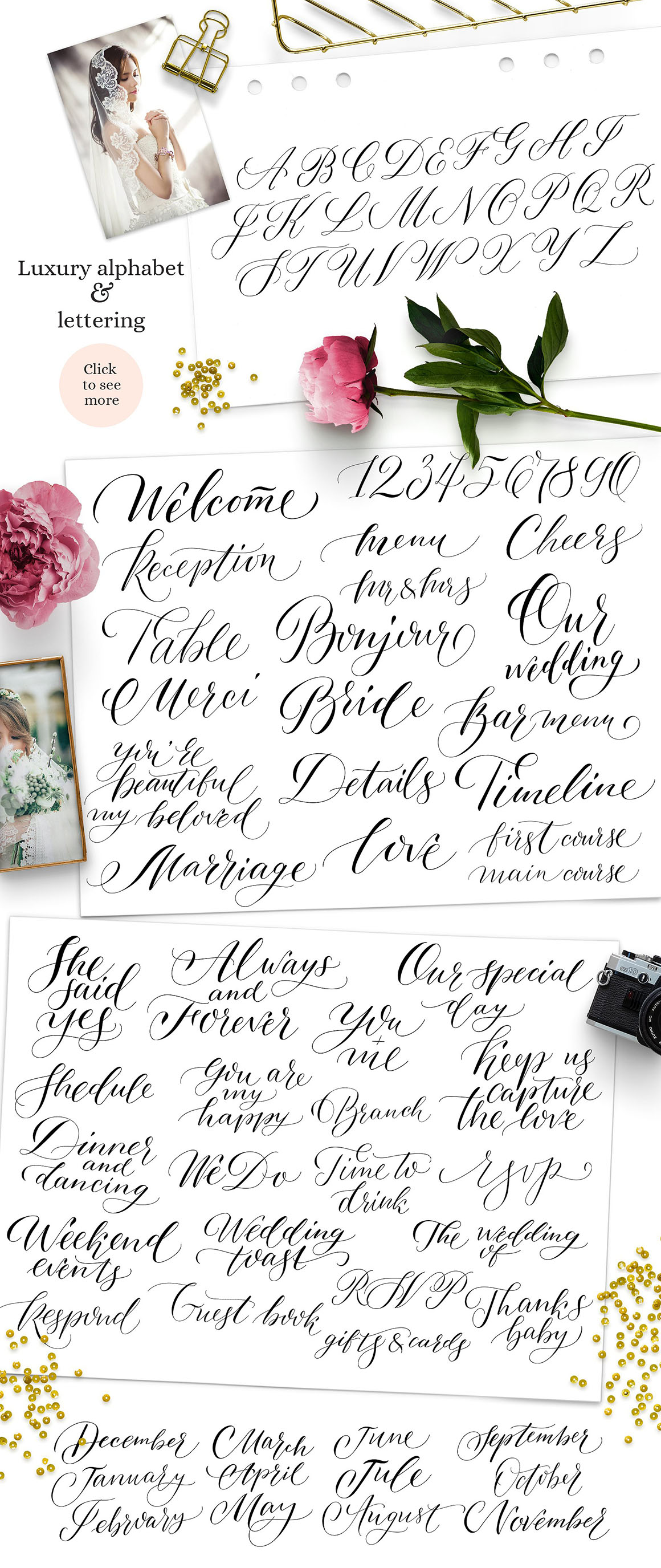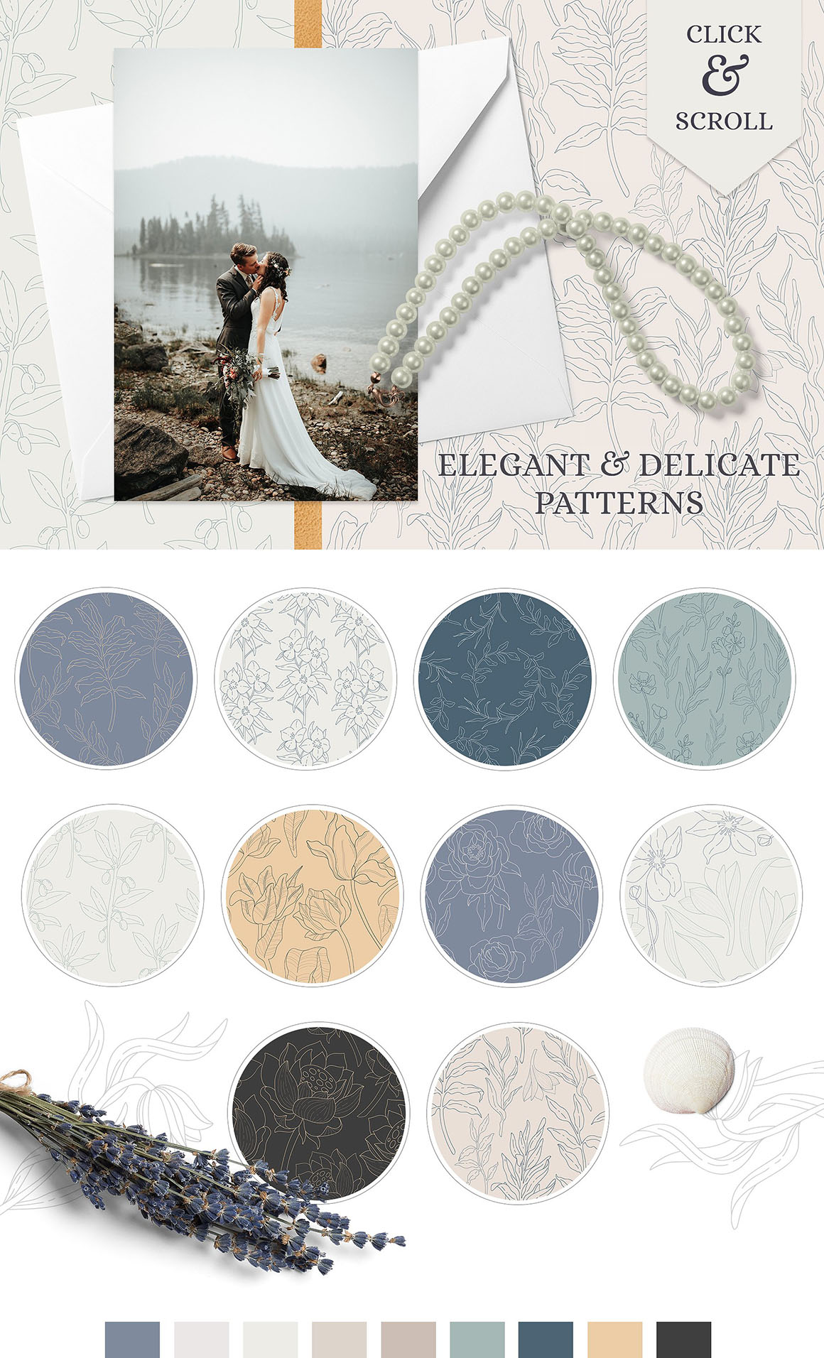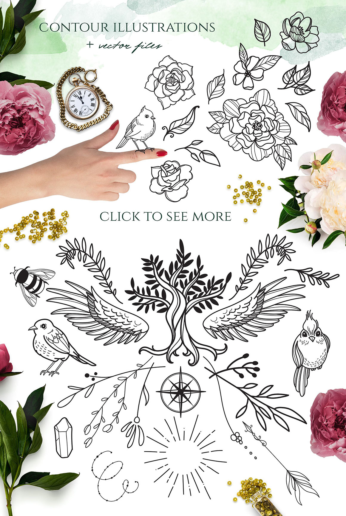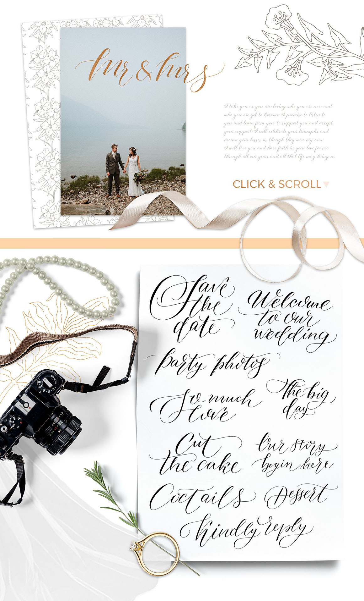 Design toolkit with romantic patterns, textures, calligraphy graphics and contour flowers, pre-made templates. Product is perfect for your wedding stationery, you can combine and move elements, letterings, patterns, textures. All lettering is hand-drawn and unique! Lovely and beautiful graphics can be used for branding, logo design, packaging, product and so on.