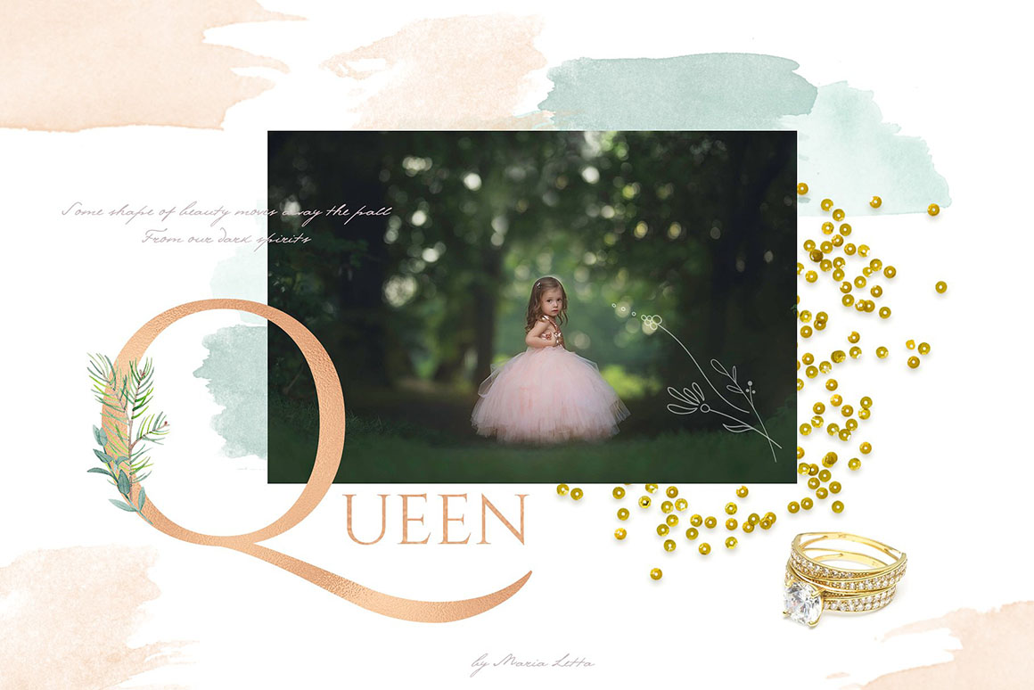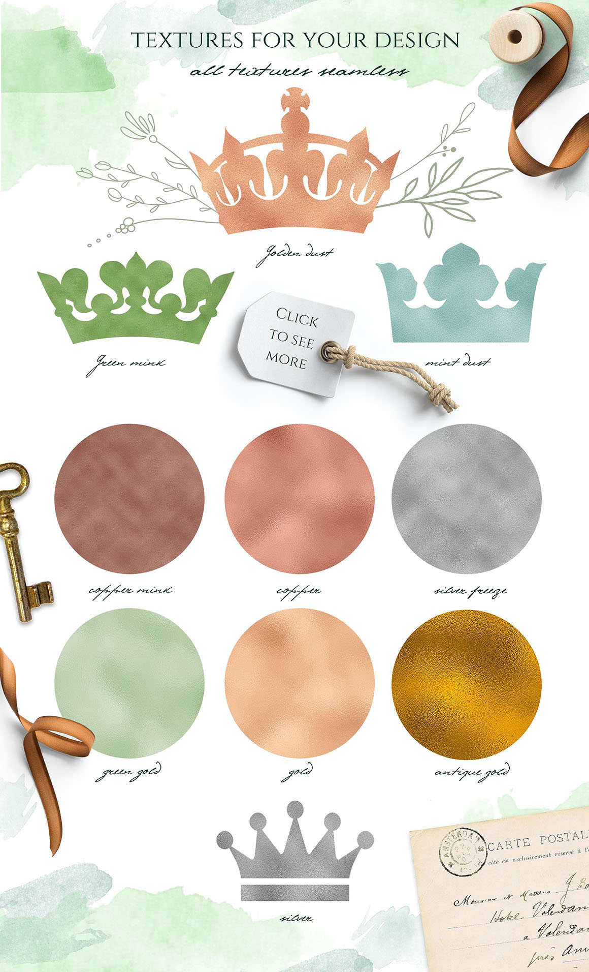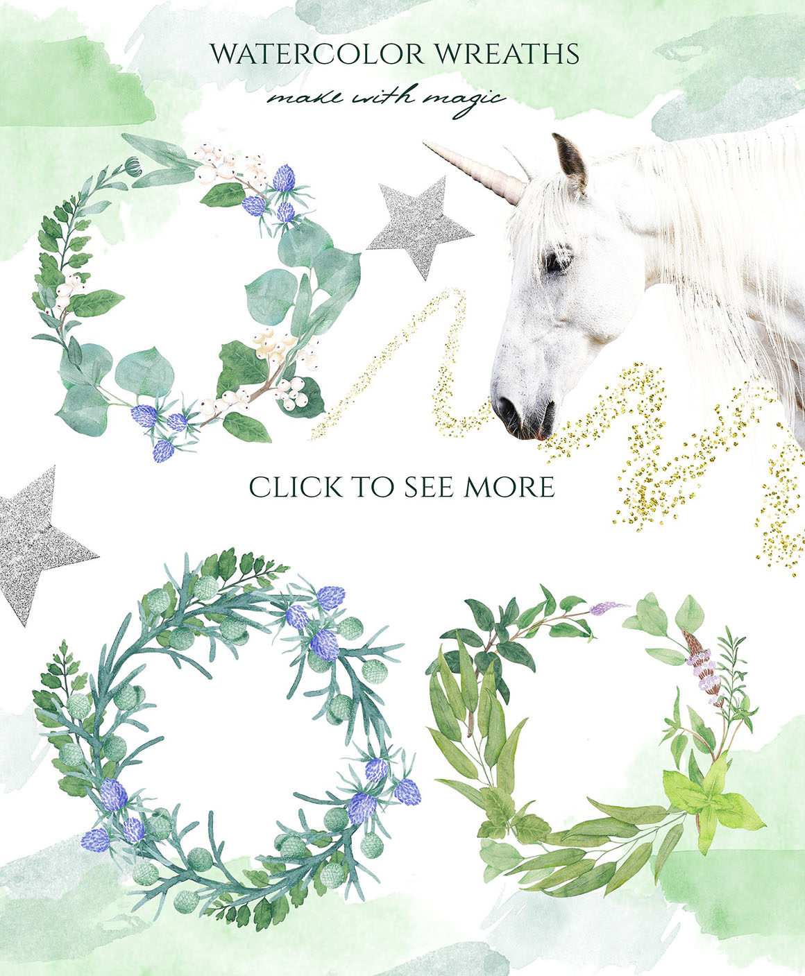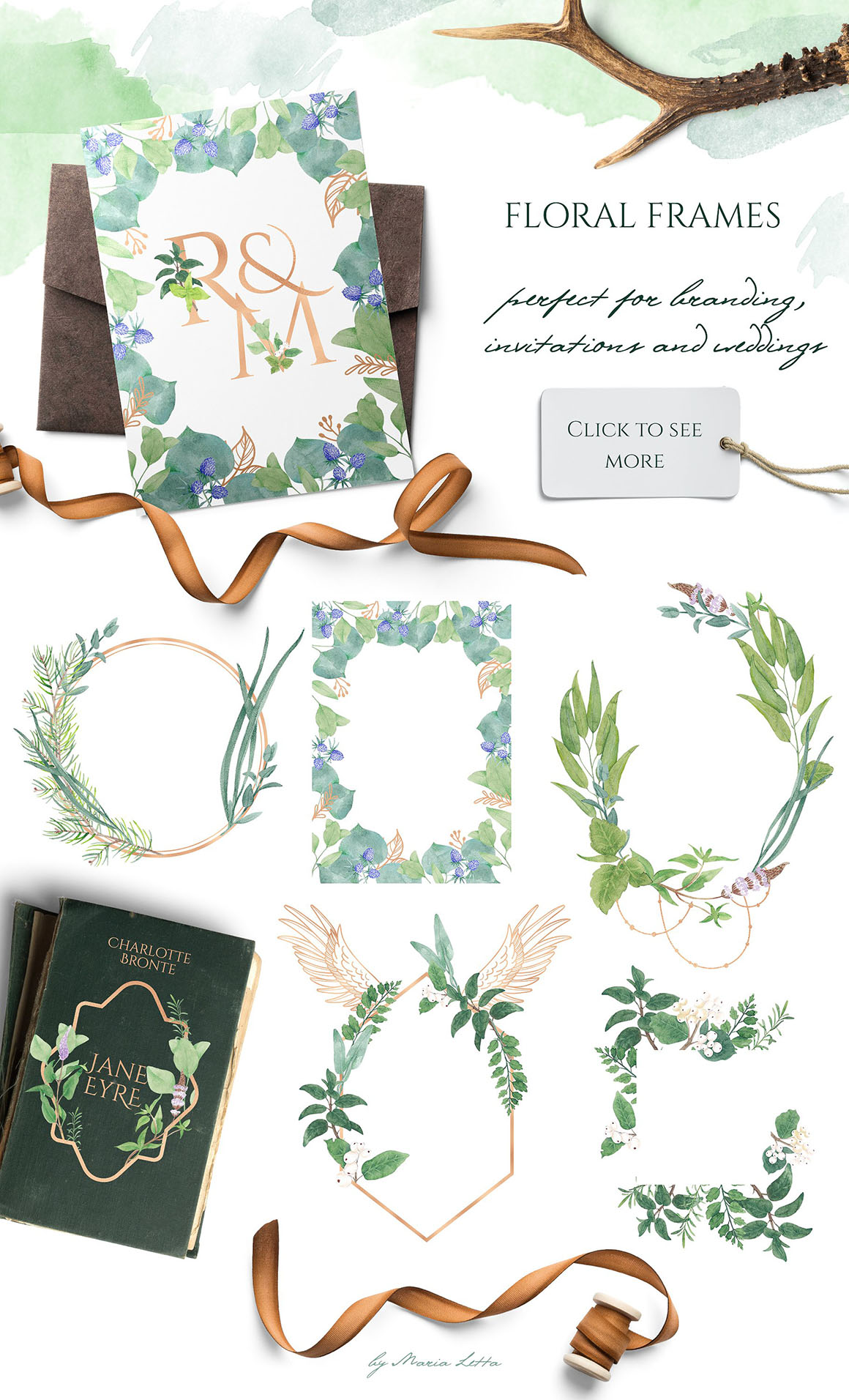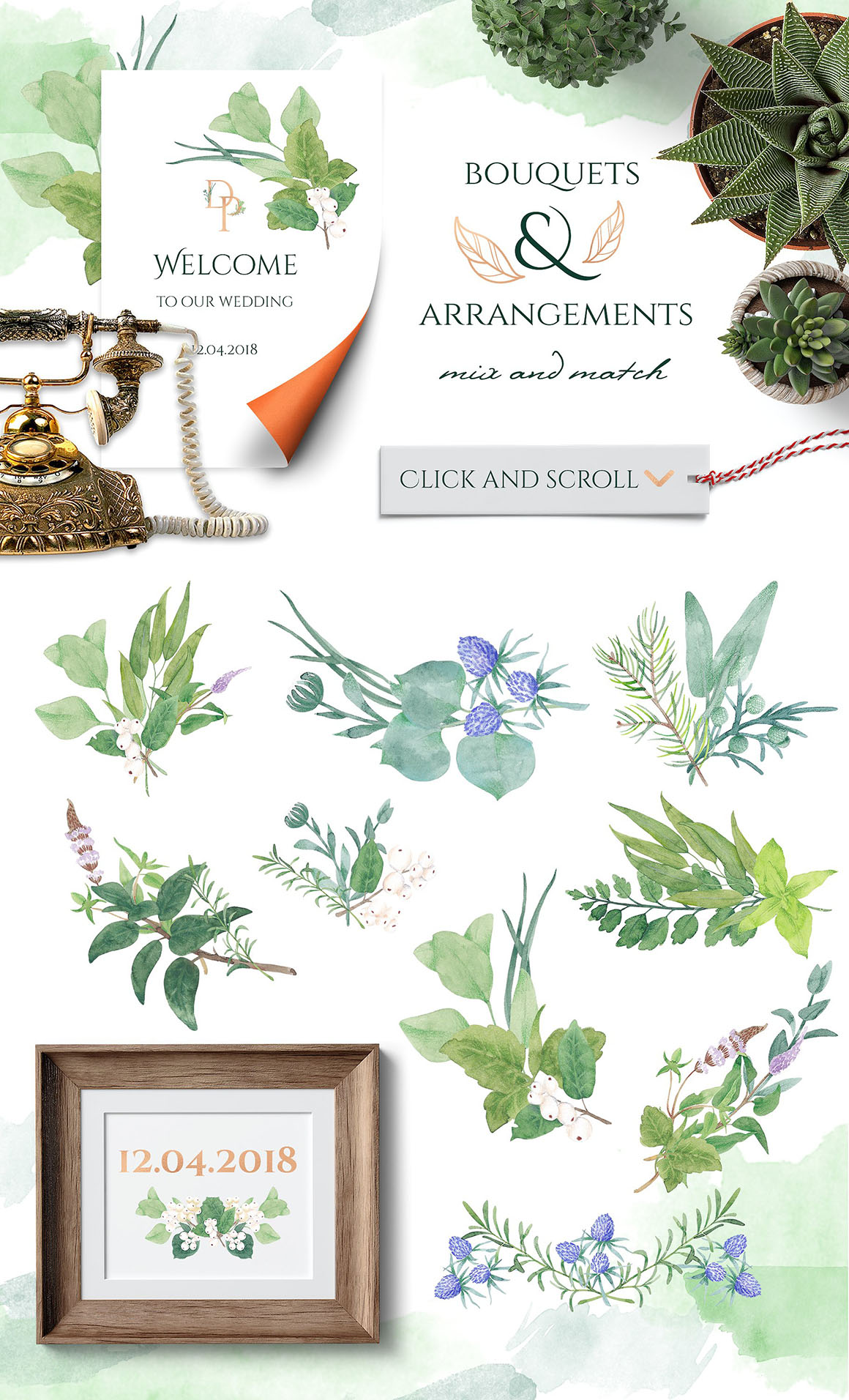 Welcome to The Green Kingdom! Over 150+ graphic elements for your amazing designs! Everything to make wedding day a fairy tale. Play and make fantastic fun design a forest green wedding invitation, greeting cards, birhtday cards and more. You will get pre-made frames, bouquets, seamless textures, two variants of alphabet and so on.