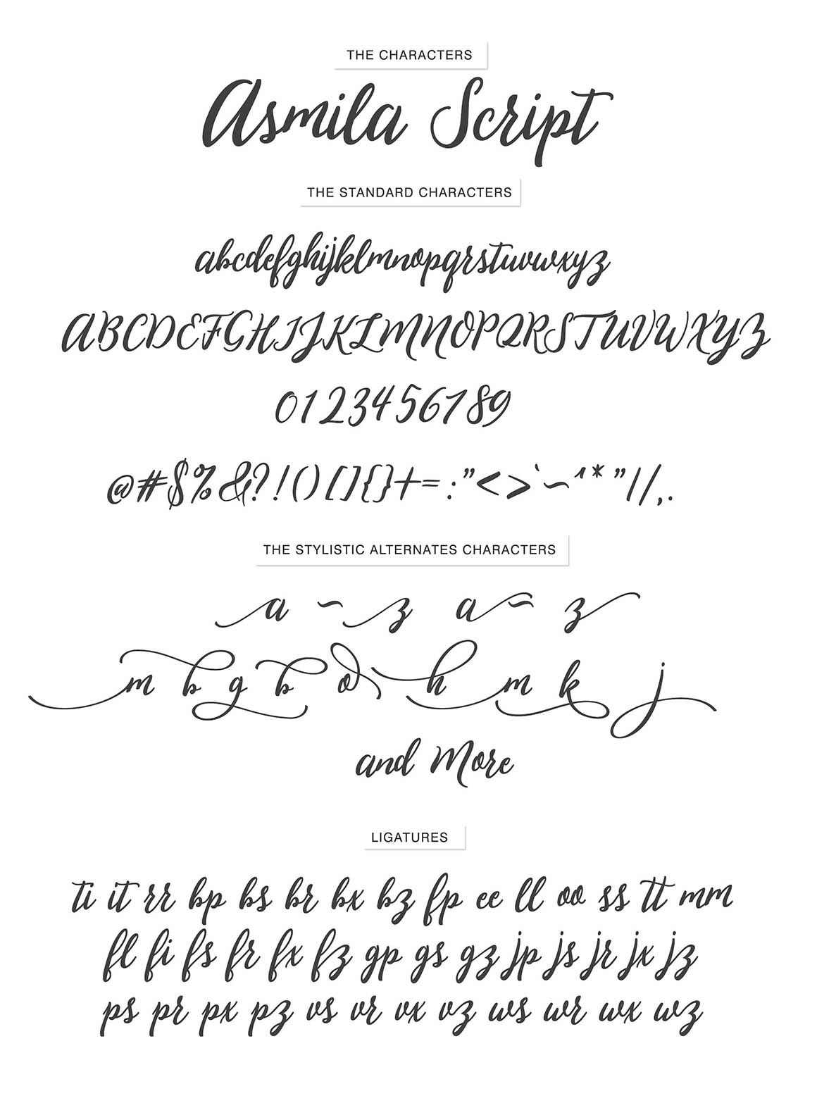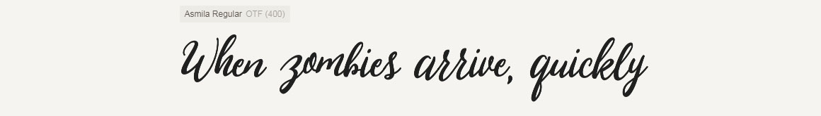 Asmila Script is a font that has a modern rhythmic base is varied, delicious views and elegant touch. Can be used for various purposes. such as title, signature, logo, wedding invitations, t-shirts, letterhead, signage, labels, newsletters, posters, badges etc. Asmila Script features 400+ glyphs to 140 characters alternatives. including initial and terminal letters, alternates, ligatures, and multiple language support.