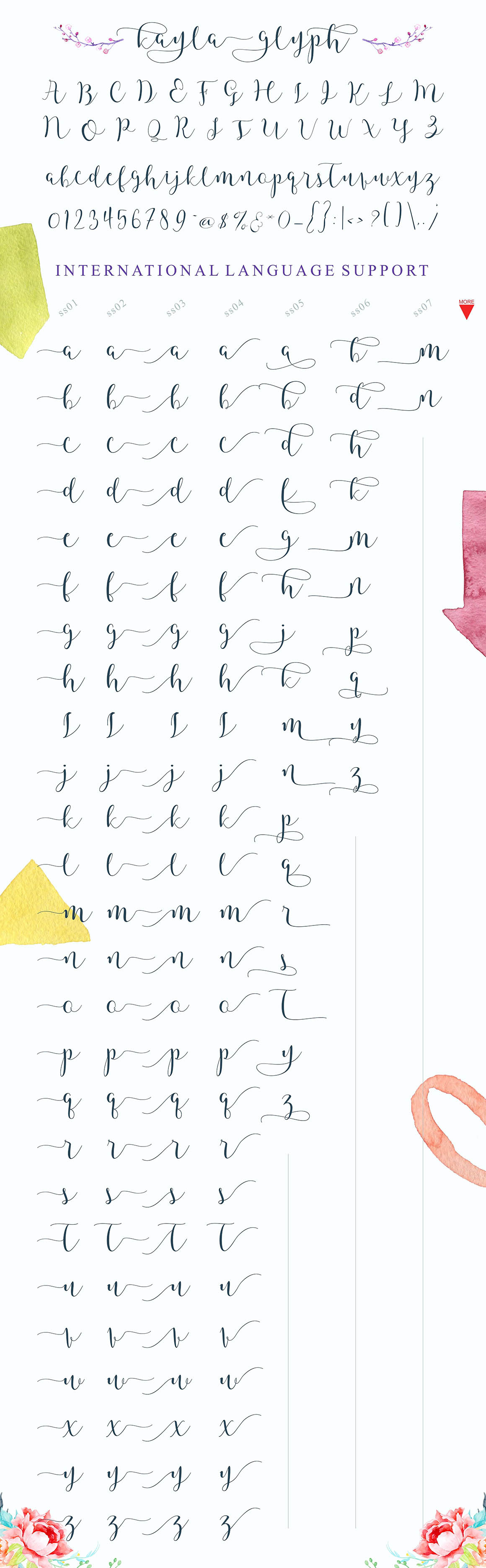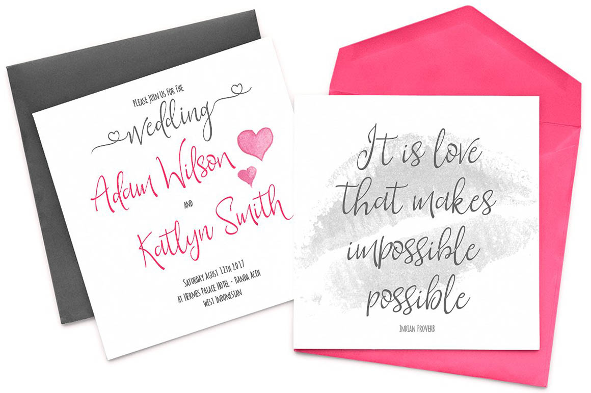 Introducing Kayla Script – a modern script with a sweet style calligraphy, decorative characters and a dancing baseline! So beautiful on invitation like greeting cards, logotype, branding materials, business cards, quotes, posters, and more!