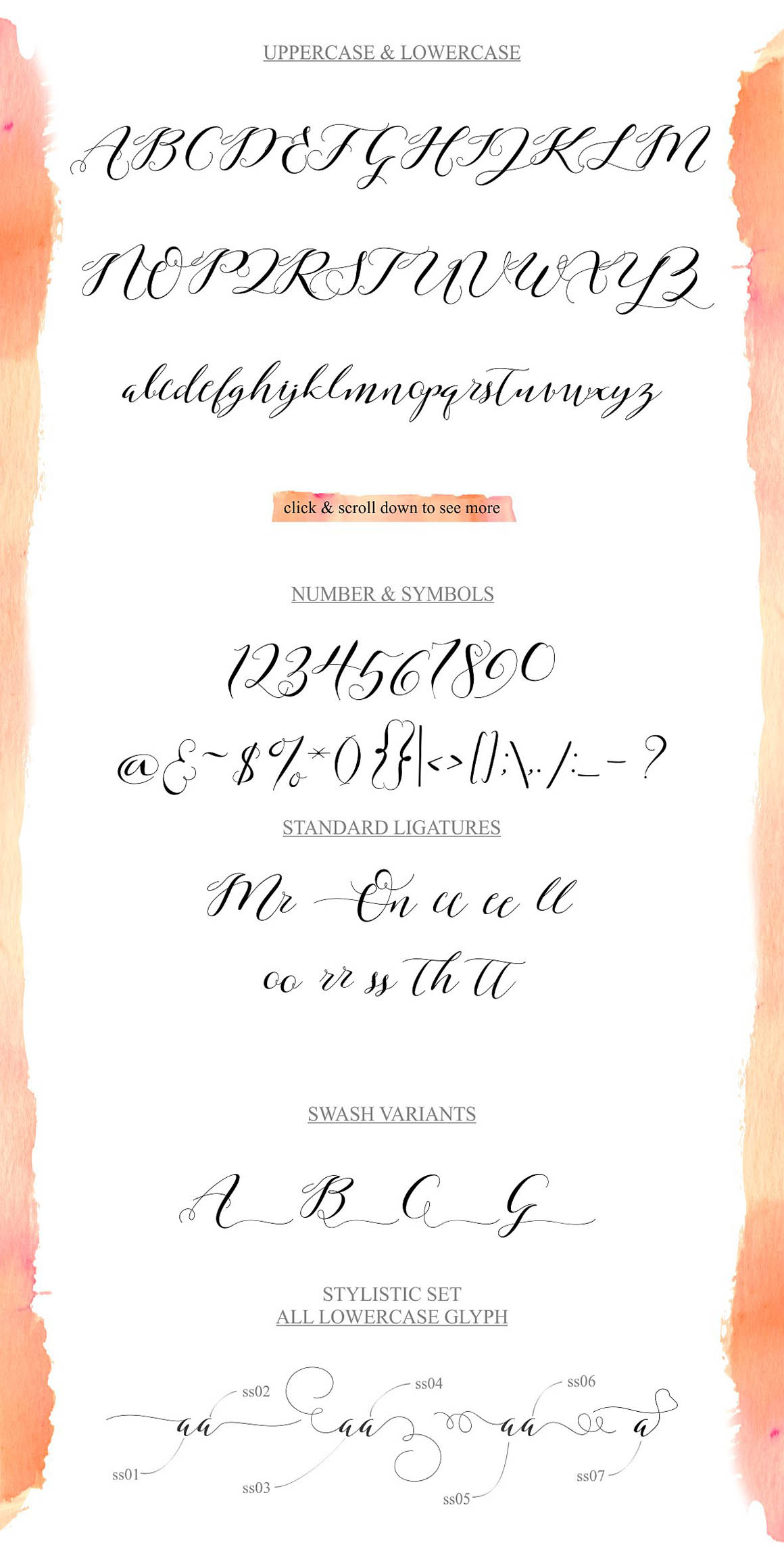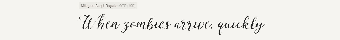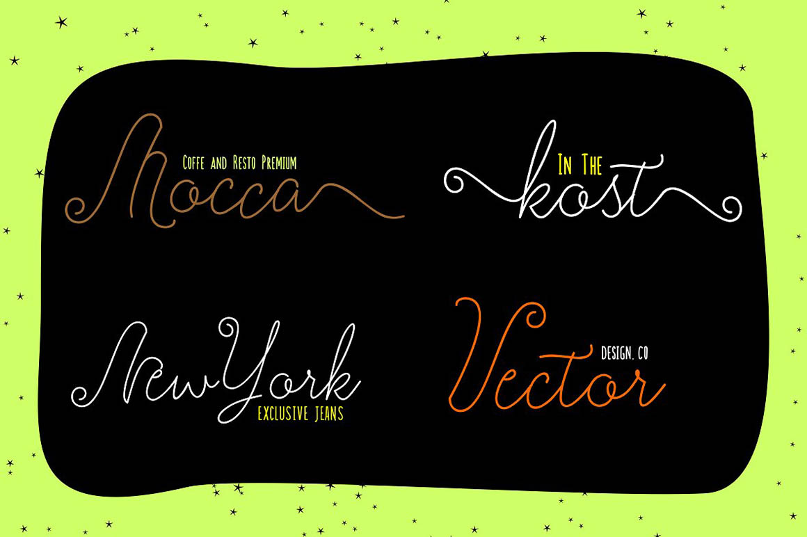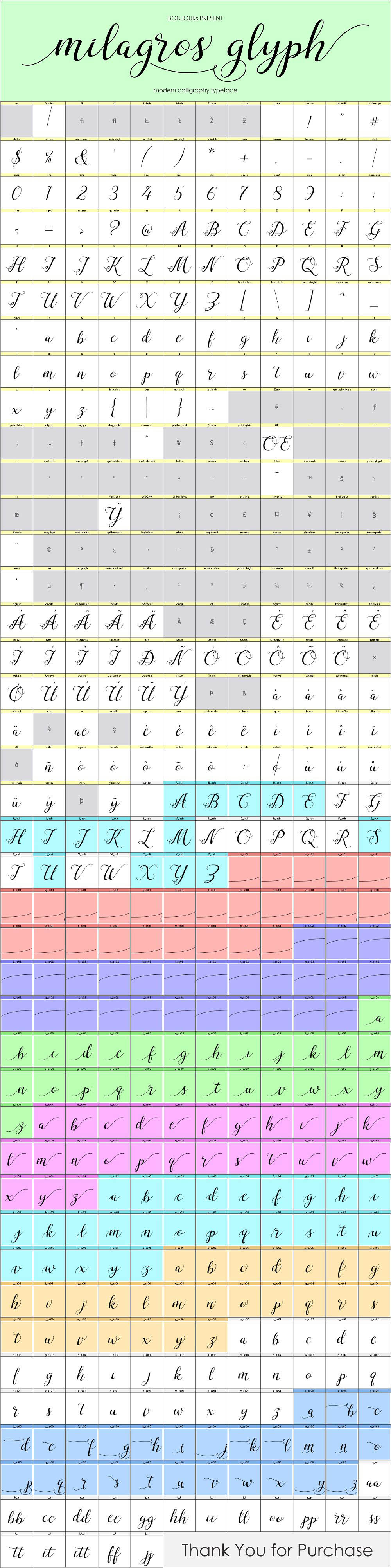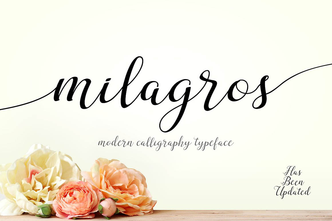 Milagros Script is handwritten stylish modern calligraphy fonts, combines from copperplate to contemporary typeface with a dancing baseline, modern and elegant touch. Can be used for various purposes.such as headings, signature, logos, wedding invitation, t-shirt, letterhead, signage, label, news, posters, badges etc. Milagros Script features 400+ glyphs and 241 alternate characters. Including initial and terminal letters, alternates, ligatures and multiple language support. How do I access the alternate characters? The alternates are accessible by turning on ‘Stylistic Alternates’ and ‘Ligatures’ buttons on in Photoshop Character panel, or via any software with a glyphs panel; e.g. Adobe Illustrator, Photoshop CC, Inkscape.