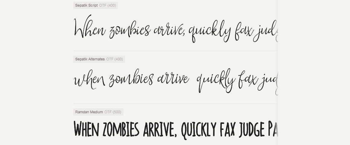 Introducing Sepatik Script! present to you with swashes and spin. They are here Warm and decorative hand-lettered fonts fresh. This is perfect for weddings, logo, stationery and more! 3 files of decorative and unique glyphs. Everything you create will be a great work truly unique art. The combination is endless! And so much fun !! Multi-language supported. Both can be accessed in all the program is very easy to use. Just highlight a letter you want to change and choose from a selection of alternative file. Not having and alternate glyphs panel? No problem. I have added all the extra characters to alternative file to easily access all the extra on the keyboard.