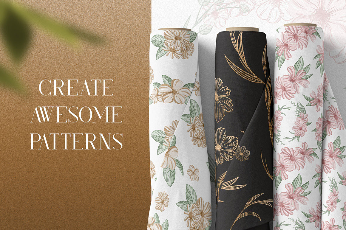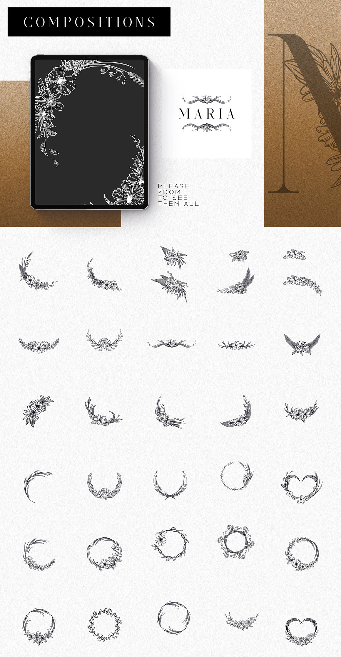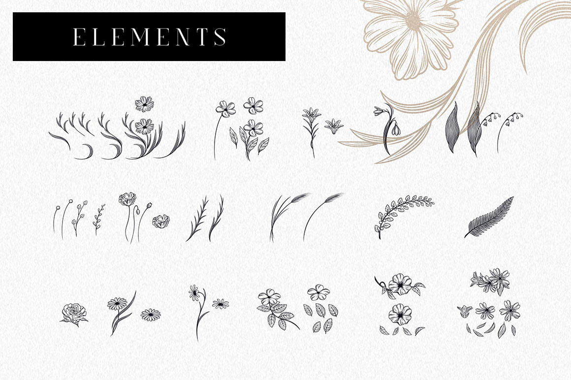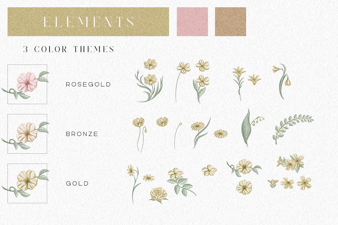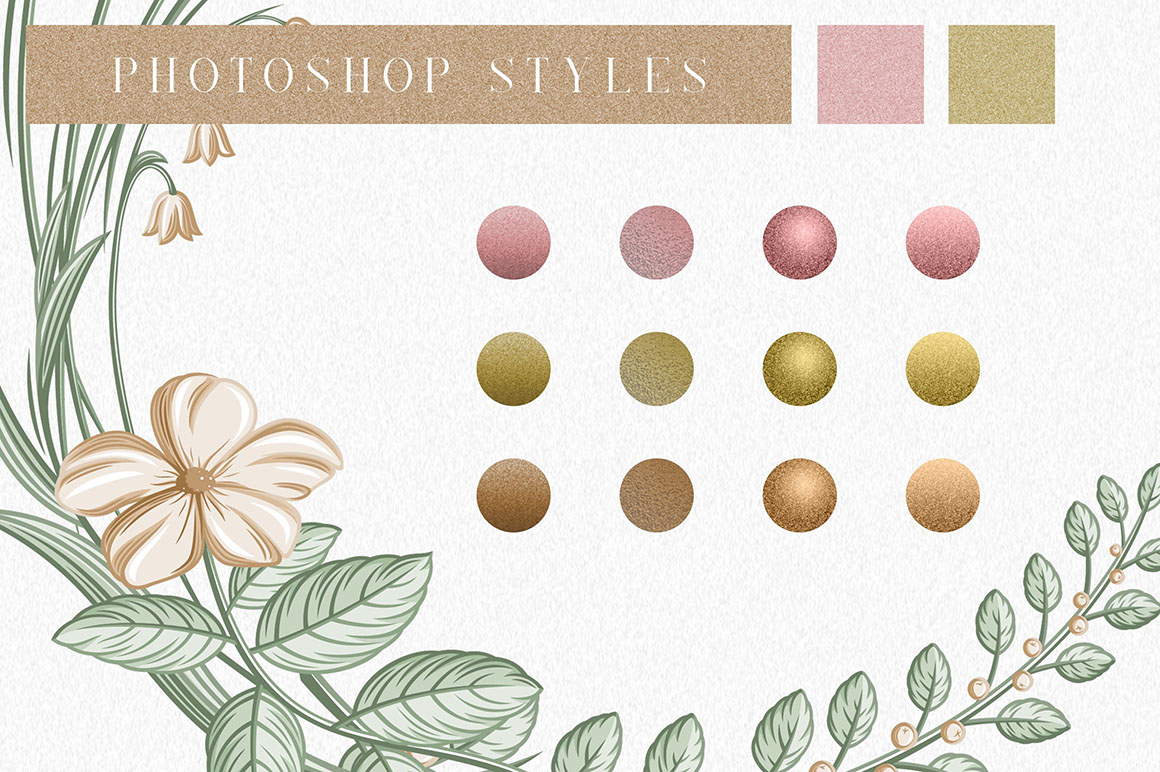 In this collection you will find – awesome botanical elements, wreaths, compositions, photoshop styles. Every illustration comes with 4 color choices – black and white, gold, bronze and rose gold. All the elements are made with solid color – that makes them easy to print š