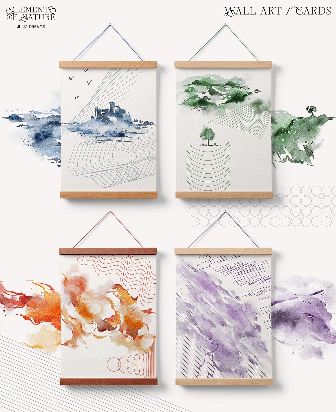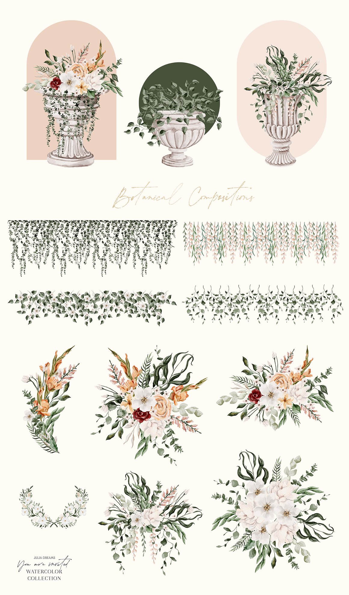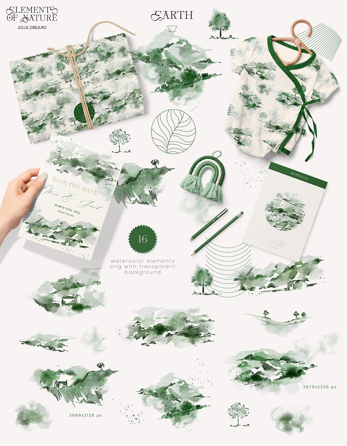 This is a collection about the unique and perfect combination of elements of nature. Hand painted with love watercolor elements can perfectly complement your project and help create a sophisticated, restrained and fashionable style. This collection was carefully crafted and great attention was paid to details. It consists of different pre-made elements and seamless patterns that can be used individually or combined with other elements. Use ready-to-use elements and patterns or create your own individual product using all these elements.