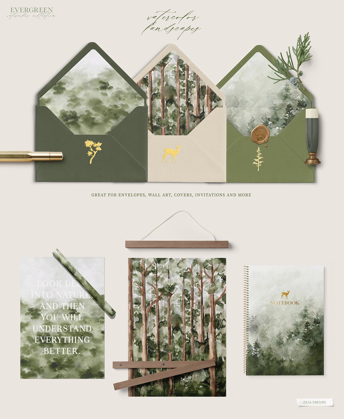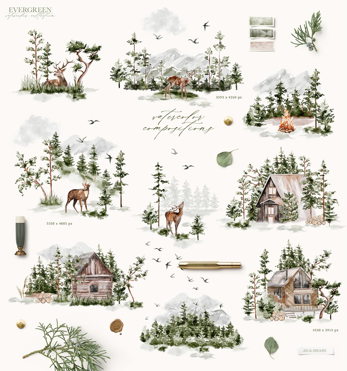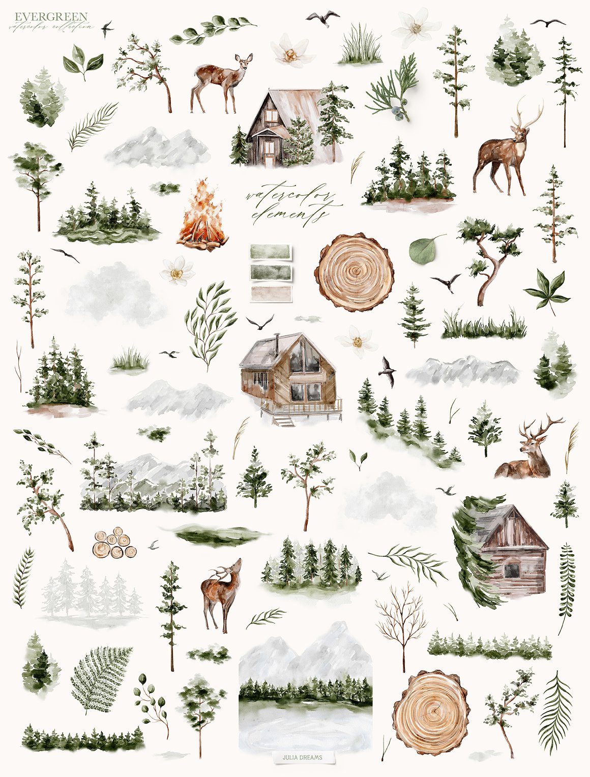 Evergreen Watercolor Forest Collection – wild flowers and evergreen trees, forest animals and majestic landscapes. Hand painted with love elements can perfectly complement your project and help create a sophisticated, restrained and fashionable style. All these elements can can add personality in your project: from wedding to stationery branding, from logo to posters and postcards. This collection was carefully crafted and great attention was paid to details. It consists of different forest elements, watercolor textures, animals, patterns that can be used individually or combined with other elements. Compatible with Photoshop, Procreate, Affinity Photo, Affinity Designer and Canva. And with any graphic editor, including Sketch, Microsoft Word & PowerPoint and more.