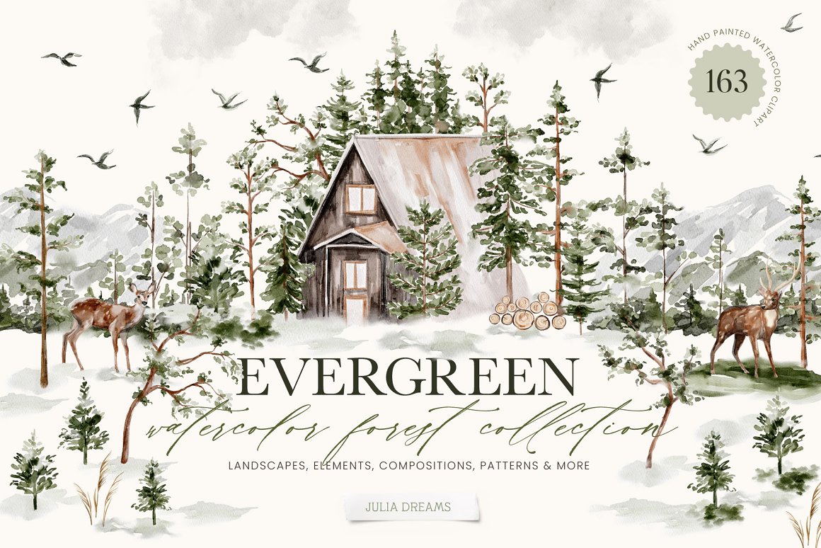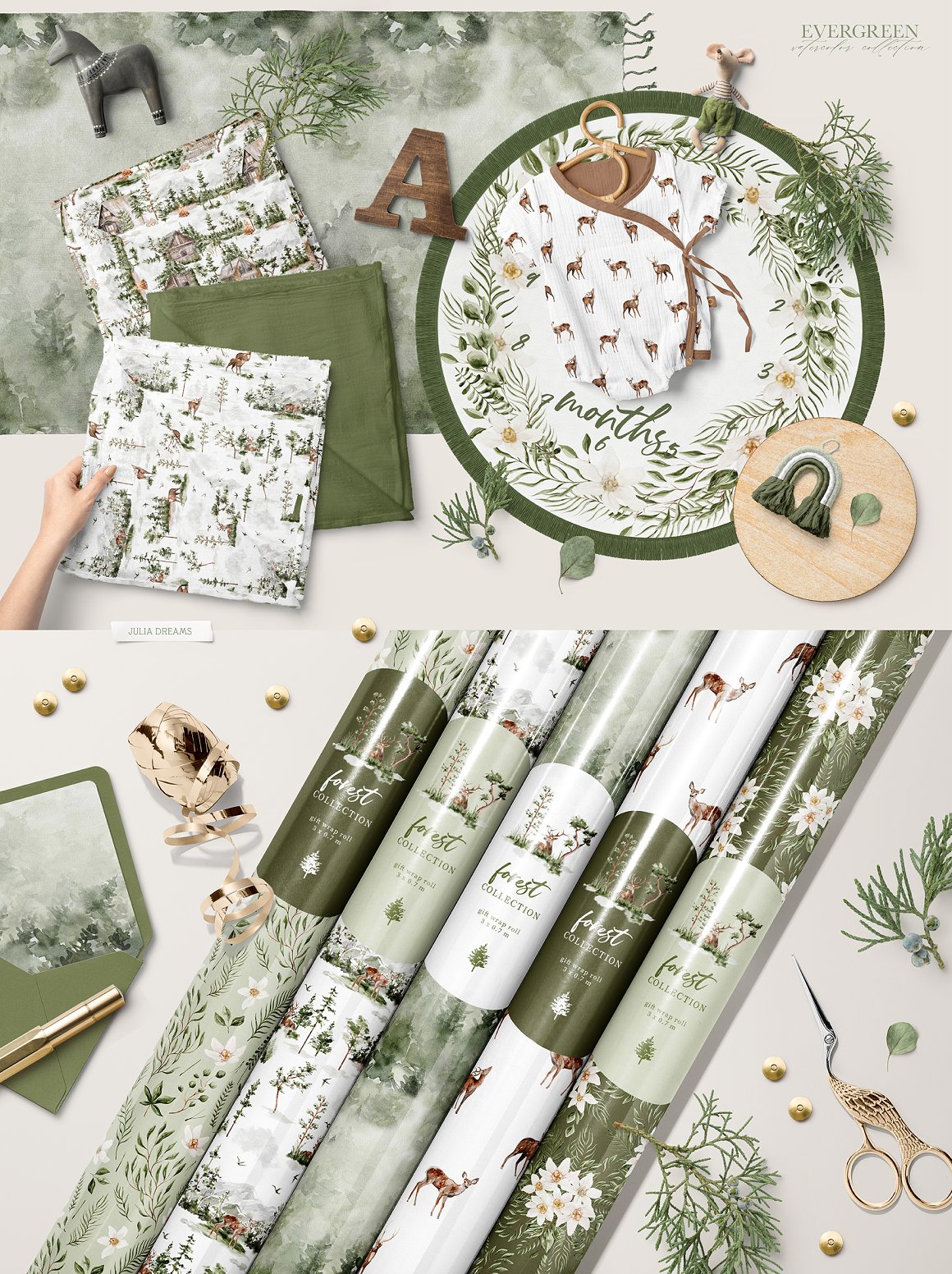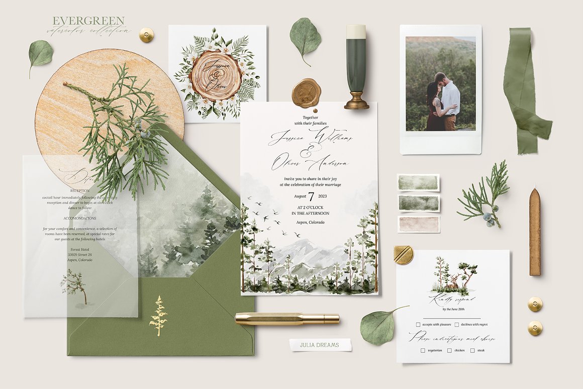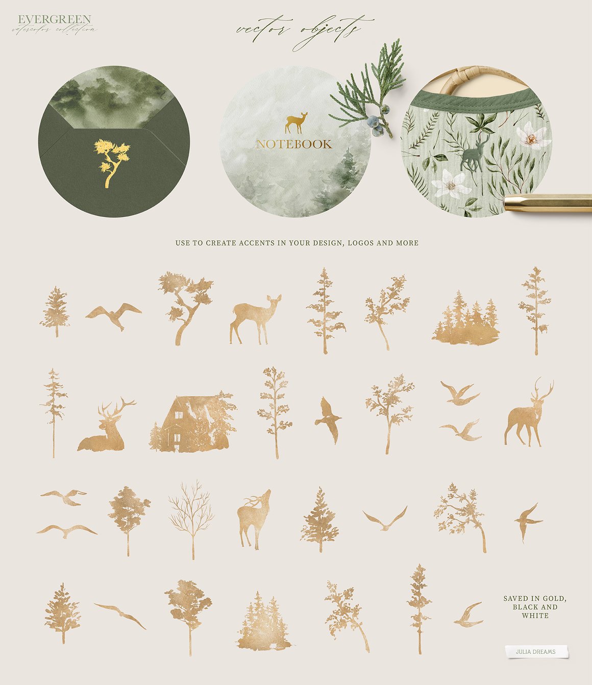 Evergreen Watercolor Forest Collection – wild flowers and evergreen trees, forest animals and majestic landscapes. Hand painted with love elements can perfectly complement your project and help create a sophisticated, restrained and fashionable style. All these elements can can add personality in your project: from wedding to stationery branding, from logo to posters and postcards. This collection was carefully crafted and great attention was paid to details. It consists of different forest elements, watercolor textures, animals, patterns that can be used individually or combined with other elements. Compatible with Photoshop, Procreate, Affinity Photo, Affinity Designer and Canva. And with any graphic editor, including Sketch, Microsoft Word & PowerPoint and more.