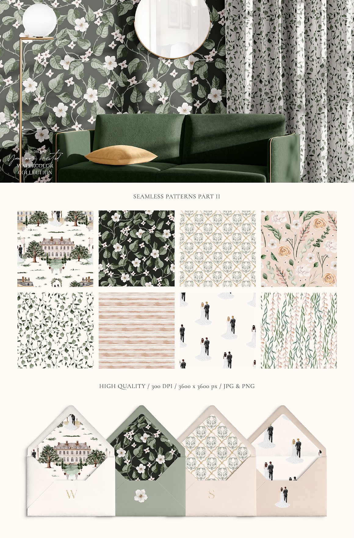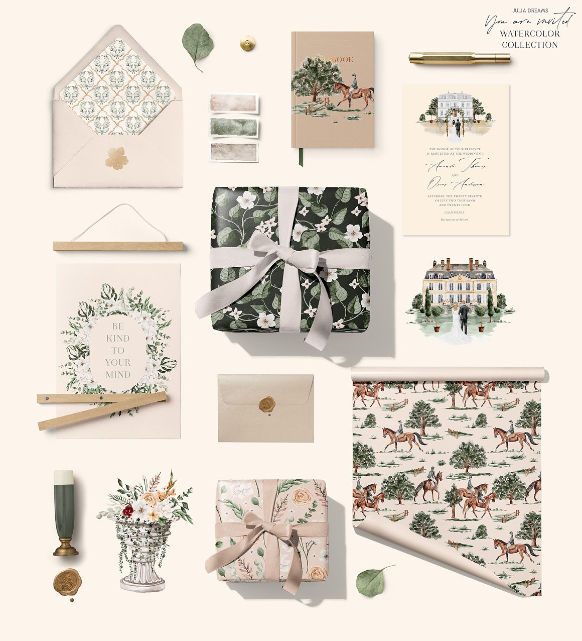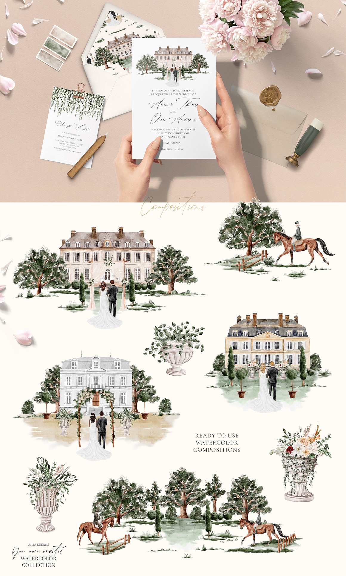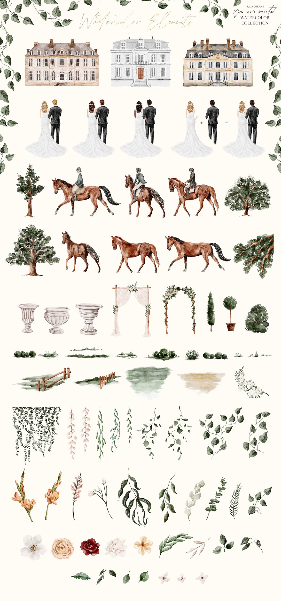 You Are Invited is a collection of tender and absolutely glorious watercolor elements. Hand painted with love watercolor elements can perfectly complement your project and help create a sophisticated, restrained and fashionable style. This collection includes watercolor illustrations of the manor house, equestrian, bride and groom, and more. This collection was carefully crafted and great attention was paid to details. It consists of different pre-made elements and seamless patterns that can be used individually or combined with other elements. Use ready-to-use elements and patterns or create your own individual product using all these elements. Compatible with Photoshop, Procreate, Affinity Photo, Affinity Designer and Canva. And with any graphic editor, including Sketch, Microsoft Word & PowerPoint and more.