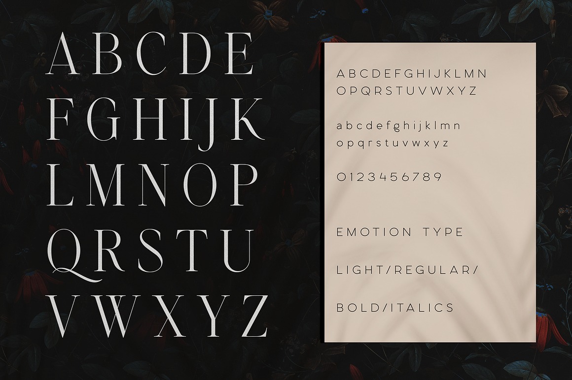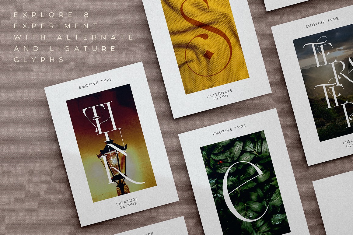 Emotive Type is a sophisticated serif font designed with an emphasis on elegance and versatility. Its rich set of alternate and ligature glyphs enables you to create dynamic, high-end typographic designs. Alongside the serif, it includes six clean sans-serif fonts, making it a versatile choice for branding, packaging, and editorial design. Supporting 87 languages, Emotive Type caters to a broad, global audience. The font reflects luxurious and expressive vibe, ideal for high-end, refined, and artistic design projects.