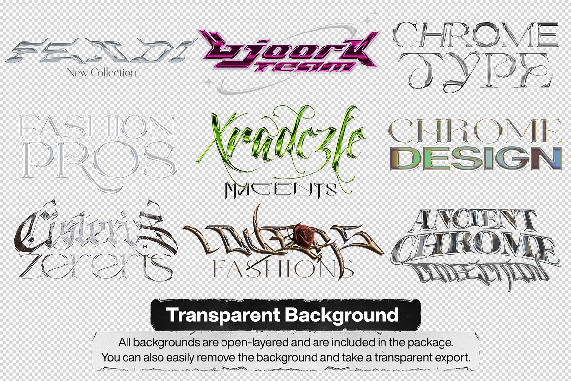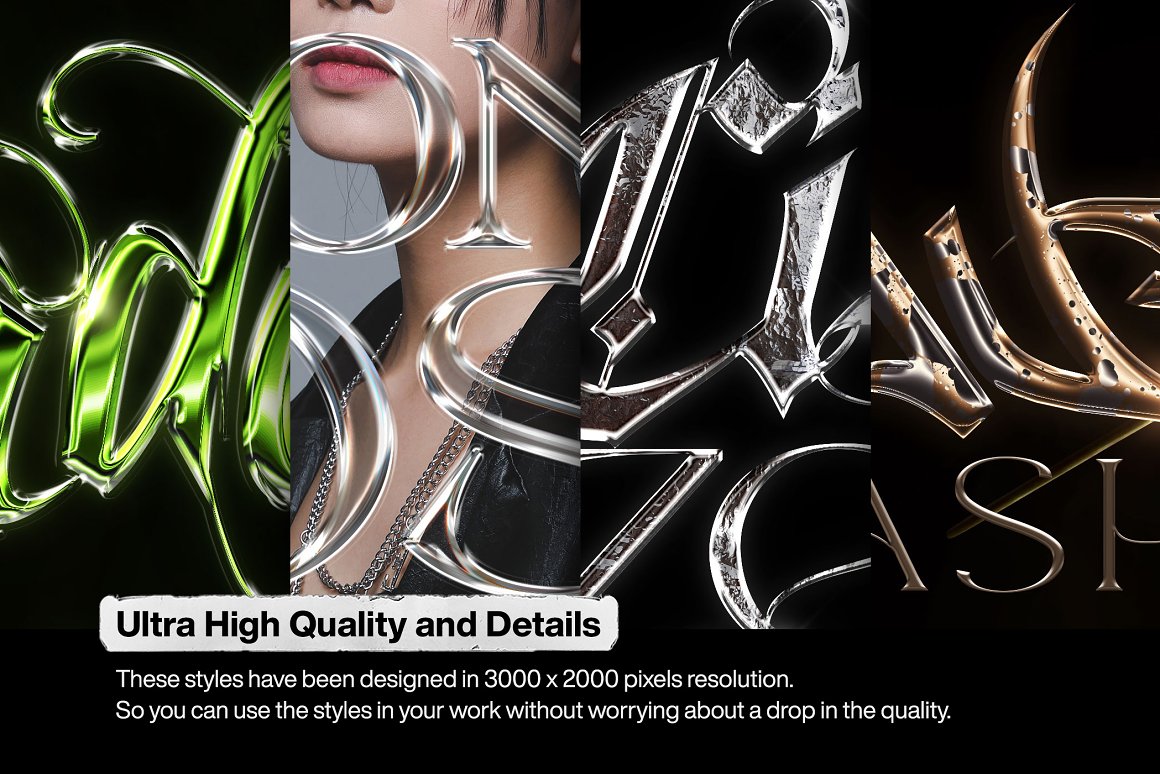 This collection is composed of styles inspired by the chrome style of design that helps you turn your plain text, logo, or shapes to a masterpiece with just a simple click. These styles will help you save hours of work and effort. Just enter your logo on the sheet and save the file. You can also customize the design as all the layers are open. Then you can export, using a background or a transparent style. We have spent more than 20 hours to create each of these styles with the highest quality possible. This package comes with 10 unique styles, with more than 200 hours going to the preparation of this package. So you can implement all you need in 5 minutes or less.