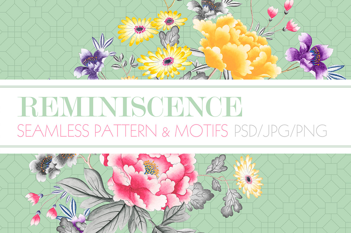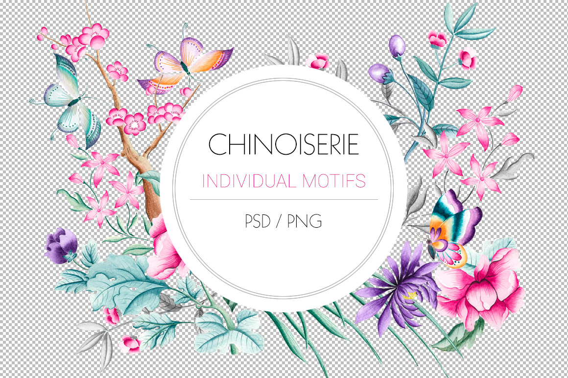 - PSD folder which consists of 2 PSD files. 1 file with Chinoiserie print and its 3 color base and the other file with all motifs in separate layers.