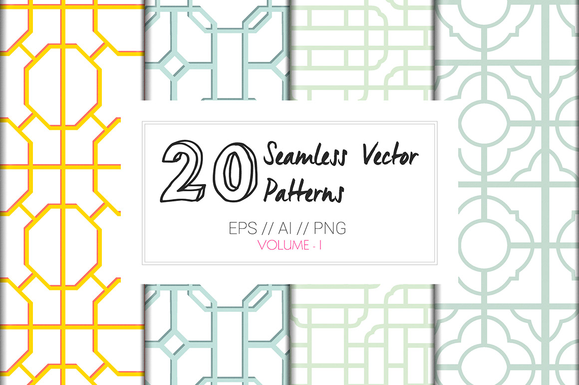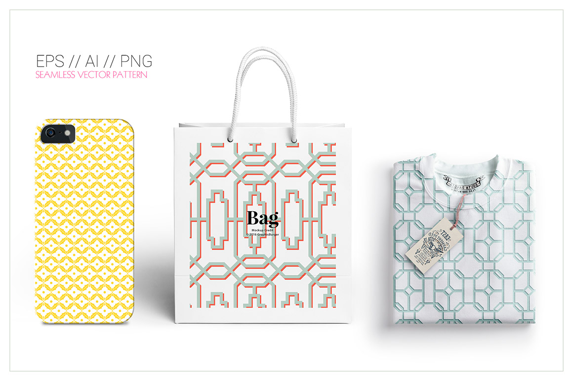 A set of exquisitely designed vector patterns inspired from fretwork patterns, walls and classic geometric shapes. All the patterns are in seamless repeat in vector format which mean they can be scaled to any size depending on your end use. Easy to modify and recolor on AI as well as photoshop using the PNG files, you could ideally use them on a variety of products such as :