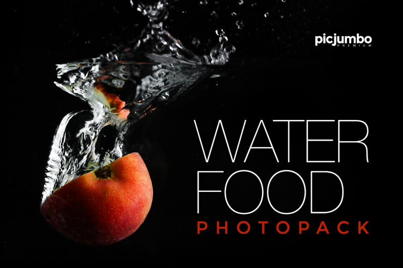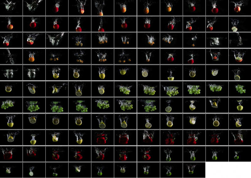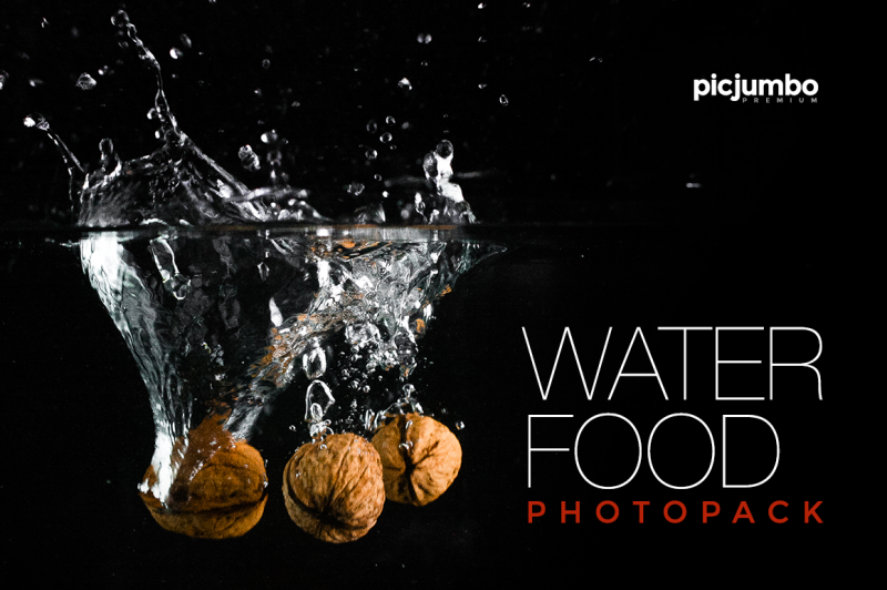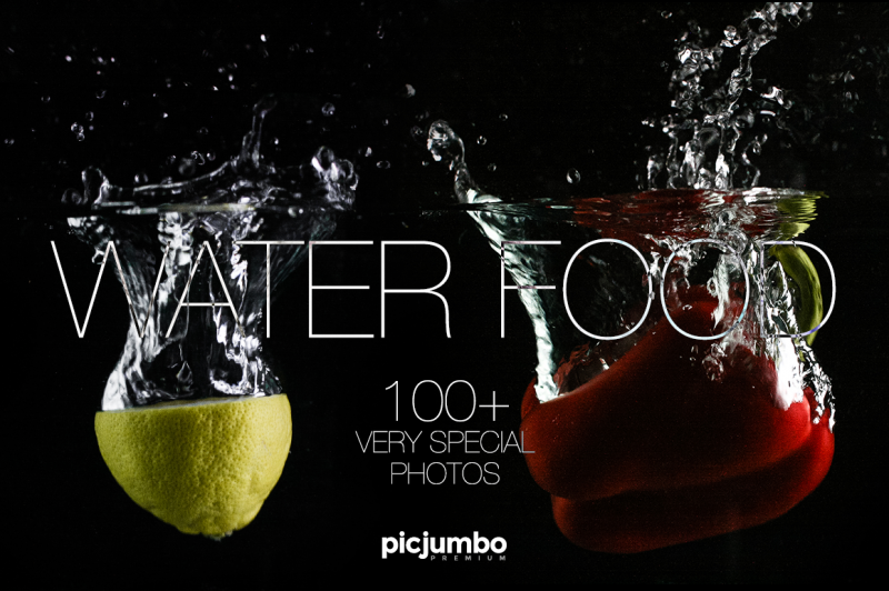 119 high resolution photos with food/things throwed in the water (apple, lemon, lime, paprika, grapes, nuts, glassy coffee cup)