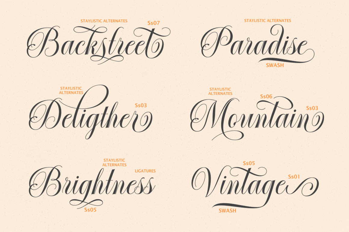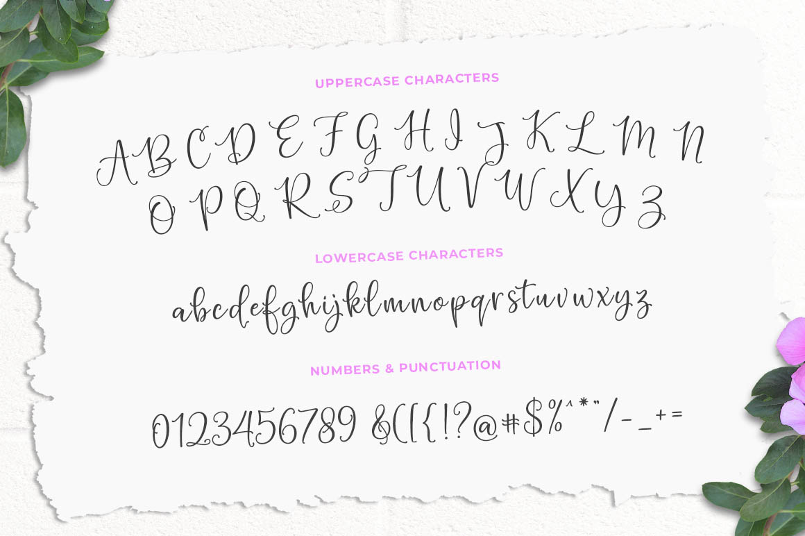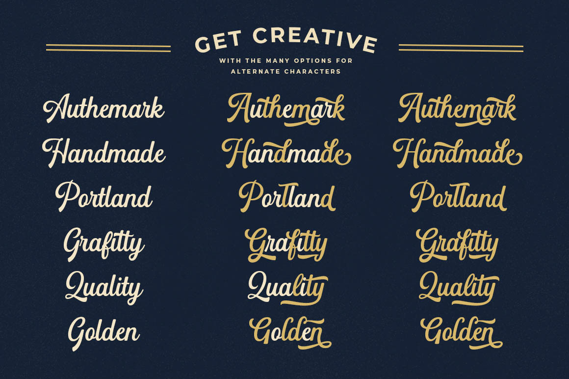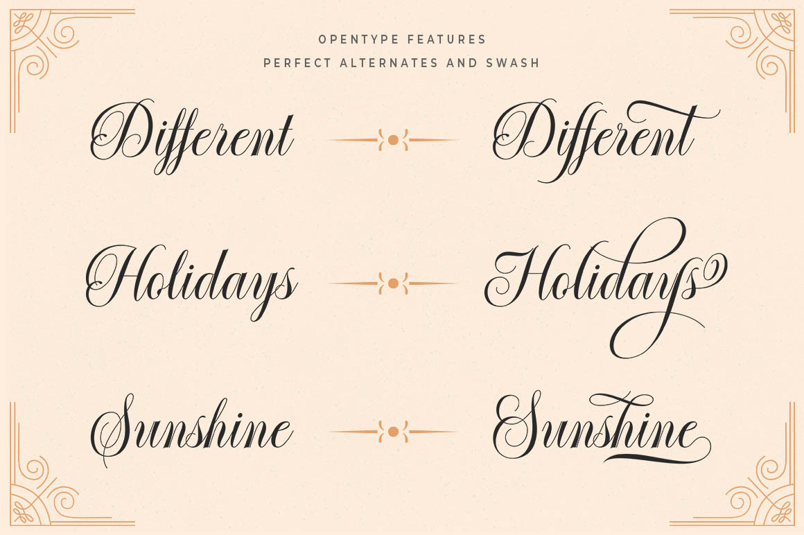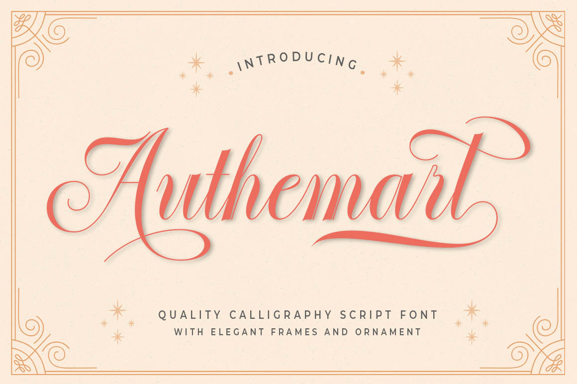 Introducing a new quality calligraphy font is Authemart Script. High-quality script fonts come with modern and vintage touches in them. Inspired by a mixture of copper calligraphy with handlettering style. OpenType feature with Stylistic Alternatives, Swash, Ligatures, Stylistic sets. It allows you to mix and match letter pairs to fit your design, and also comes with modern ornaments to make this font look elegant and perfect. Authemart is attractive like a smooth, clean, feminine, sensual, glamorous, simple and very easy to read. The classic style is perfect to be applied in various formal forms such as invitations, labels, menus, logos, fashion, make up, stationery, letterpress, romantic novels, books, greeting / wedding cards, packaging, labels, and more.