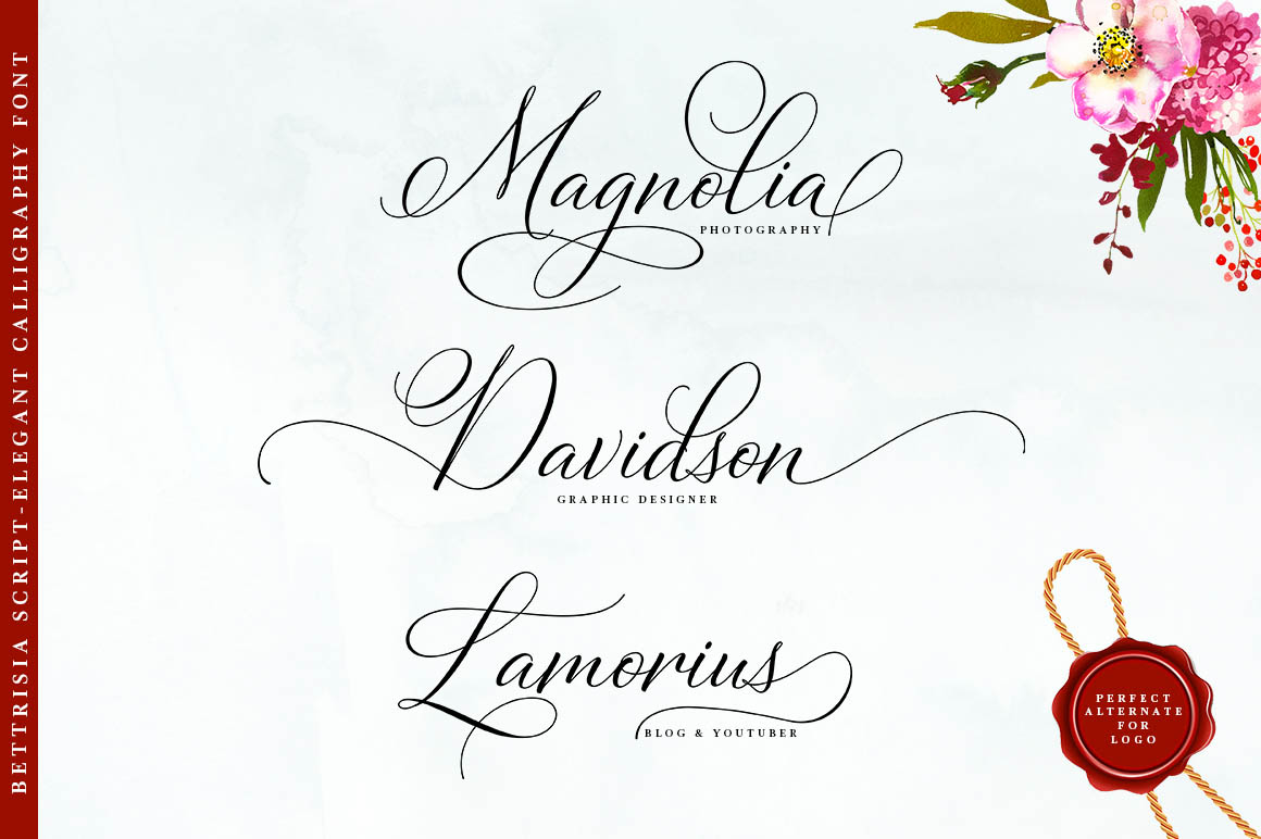 Bettrisia Script is a modern and elegant calligraphy script font that comes with very beautiful character changes, a kind of classic decorative copper script with a modern touch, designed with high detail to bring stylish elegance. Bettrisia Script Interesting scripts as smooth, clean, feminine, sensual, glamorous, simple and very easy to read, because there are many fancy and simple letter connections. I also offer a number of alternative styles that are appropriate for many letters. This font style is perfect for various designs of your work, such as invitations, labels, restaurant menus, logos, fashion, makeup, stationery, novels, magazines, books, greeting cards / wedding, packaging, labels and others.