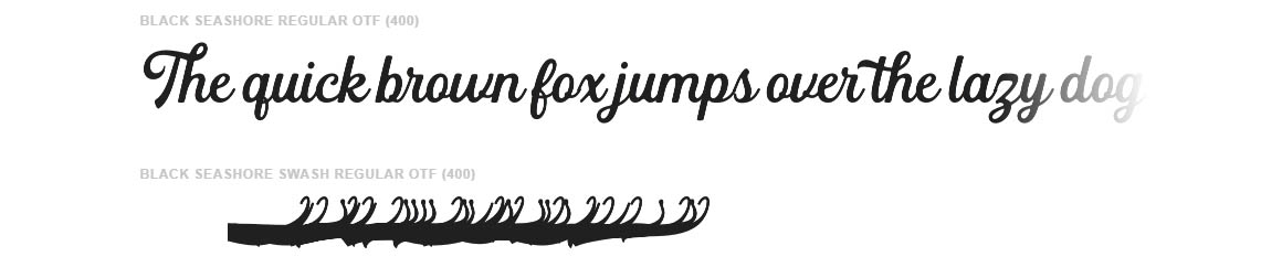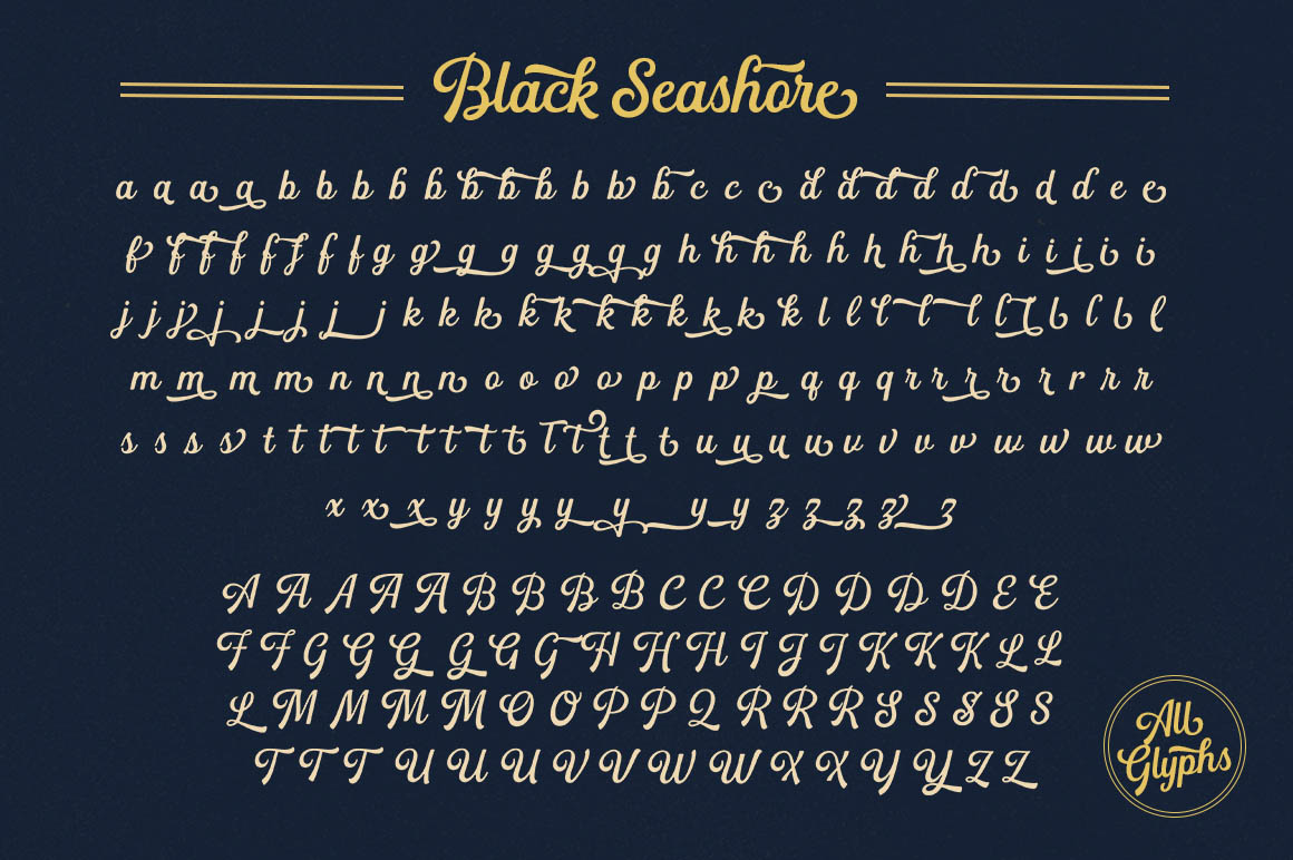 Black Seashore is a script typeface with noble and vintage looks. Created in response to current graphic design trends. Inspired by classic labels, vintage packaging, and old sign paintings. This Black Seashore will add a touch of worldly knowledge to your artwork, Classic nuance is perfect for those of you who need fonts for especially the types of logos, clothing, signage, branding, packaging, advertising, and more. I have designed a number of examples, so you can see how it can be used. Black Seashore also has many alternatives for ascender, descenders, swash, and ligature. It also has several options for tail and underline. To provide a number of good possibilities to play and make some unique designs.