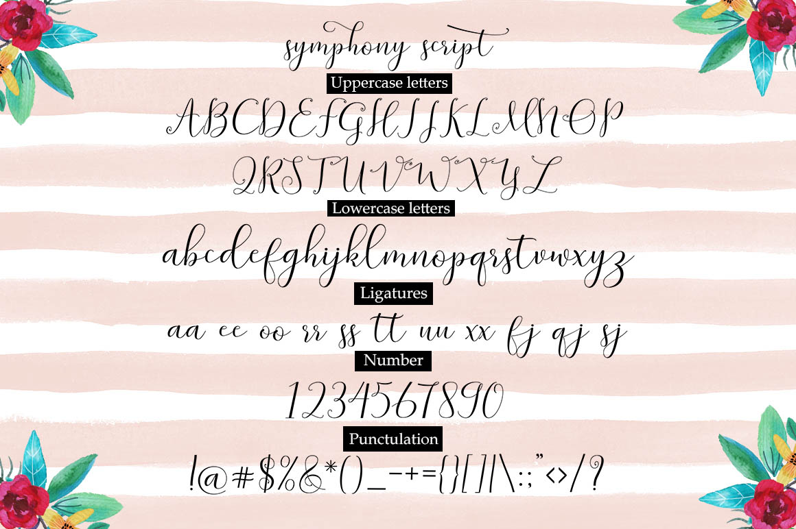 Symphony Script is modern calligraphy design, including Regular. This font is casual and pretty with swashes. Can used for various purposes. such as logo, product packaging, wedding invitations, branding, headlines, signage, labels, signature, book covers, posters, quotes and more.