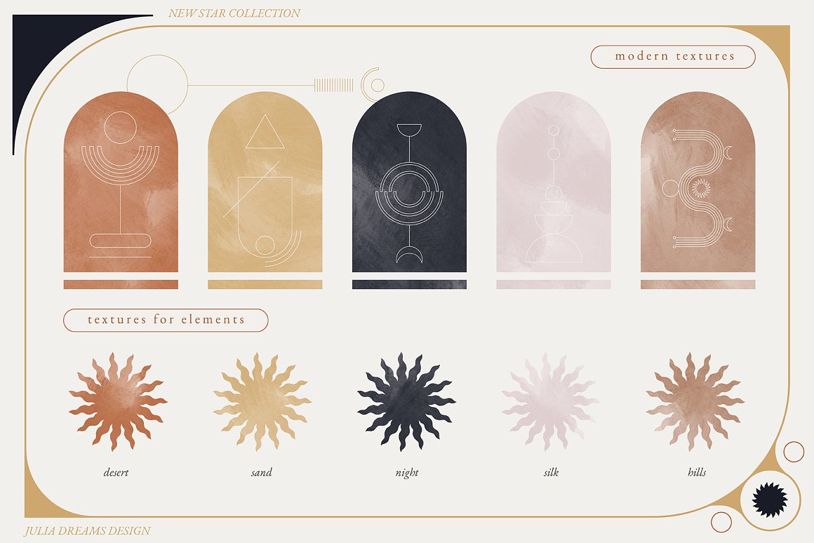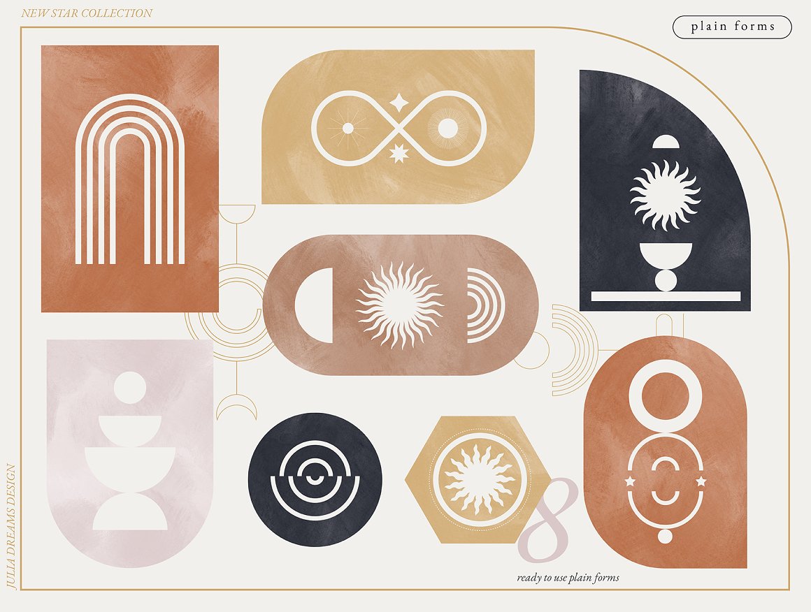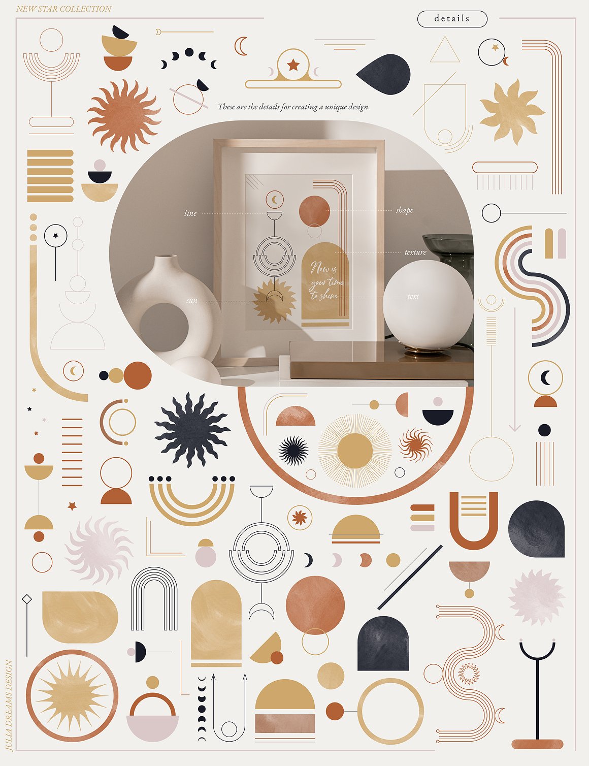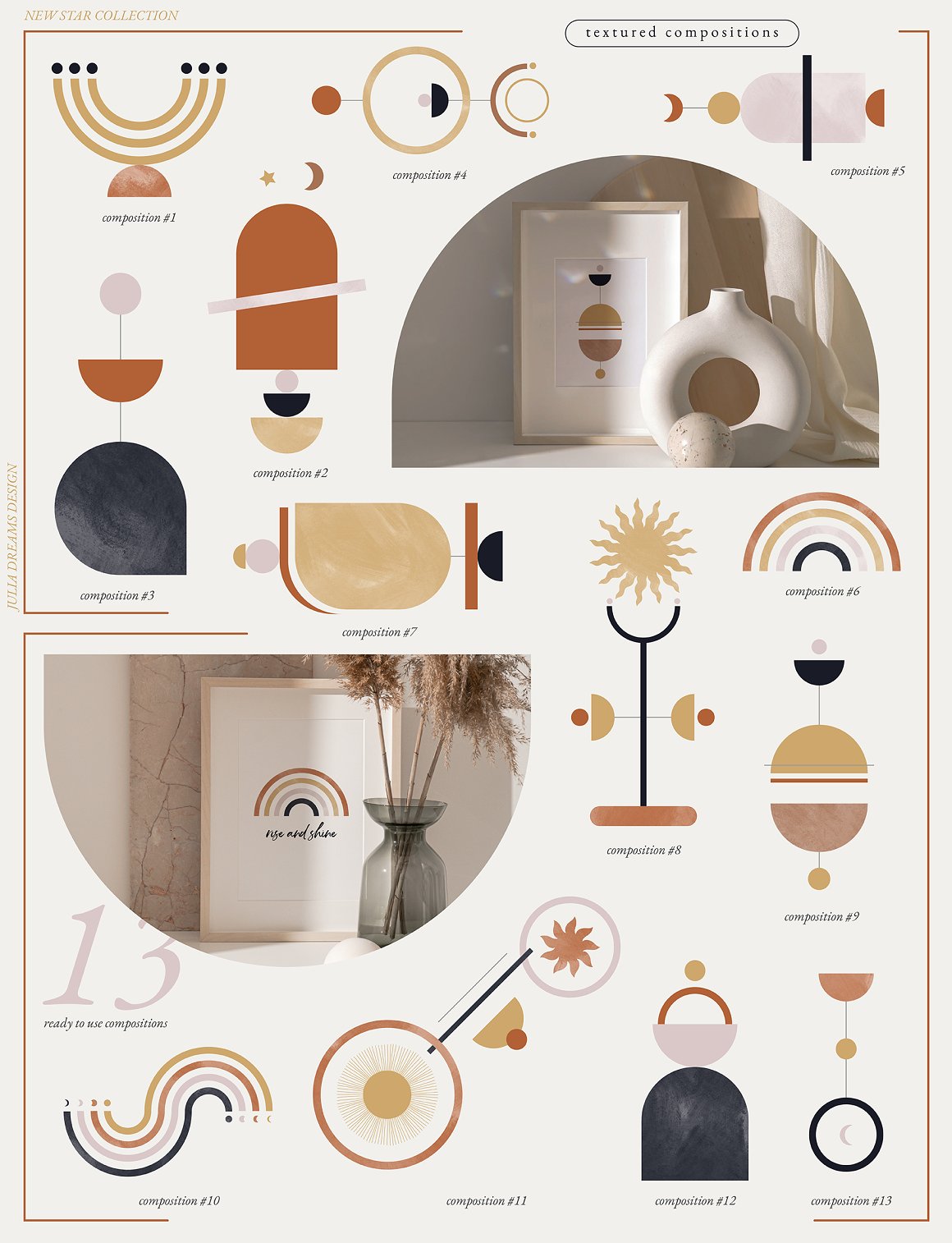 I’m so glad to introduce you my new celestial collection. It’s modern figures and lines with the shapes of the sun, moon and stars. Hand painted with love elements can perfectly complement your project and help create a sophisticated, restrained and fashionable style. All these elements can make a special atmosphere in your project: from wedding to stationery branding, from logo to posters and postcards.
