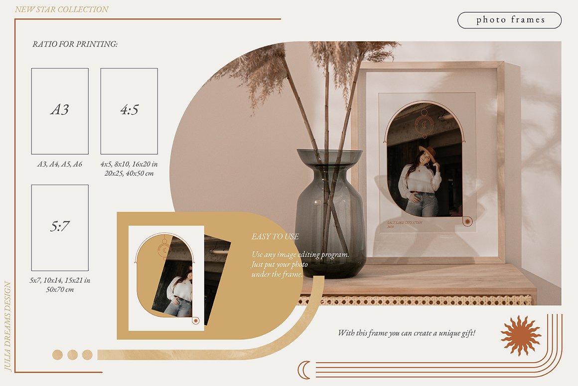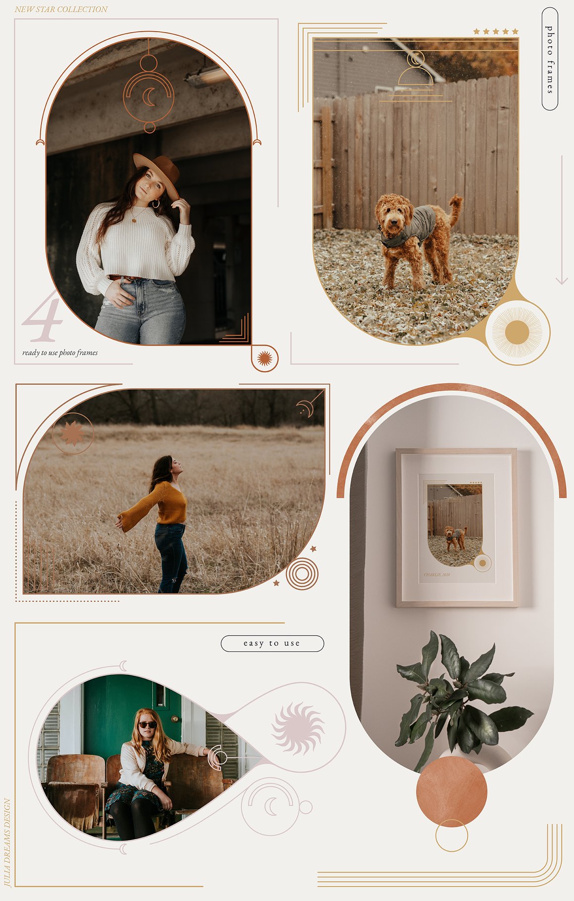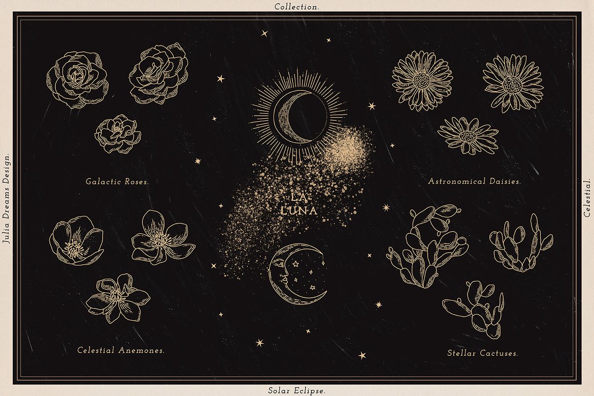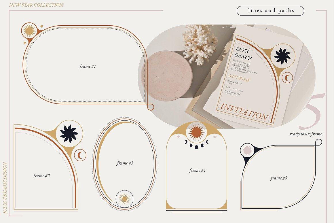 I’m so glad to introduce you my new celestial collection. It’s modern figures and lines with the shapes of the sun, moon and stars. Hand painted with love elements can perfectly complement your project and help create a sophisticated, restrained and fashionable style. All these elements can make a special atmosphere in your project: from wedding to stationery branding, from logo to posters and postcards.