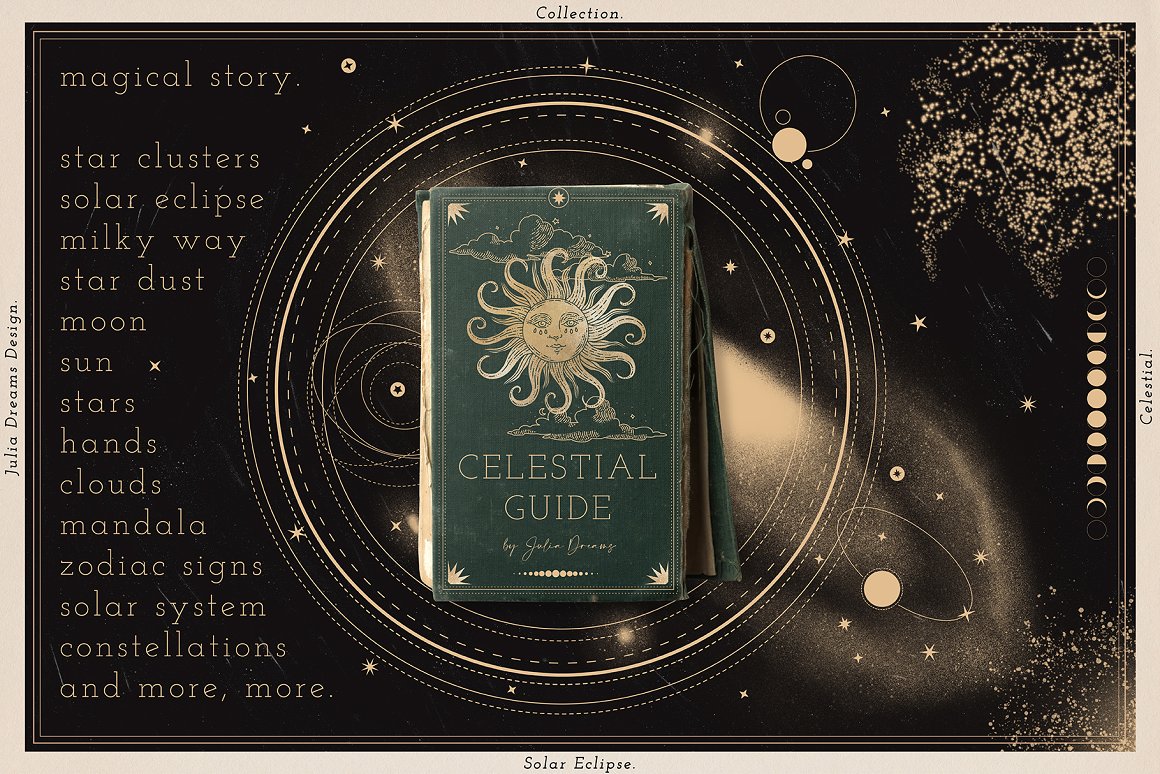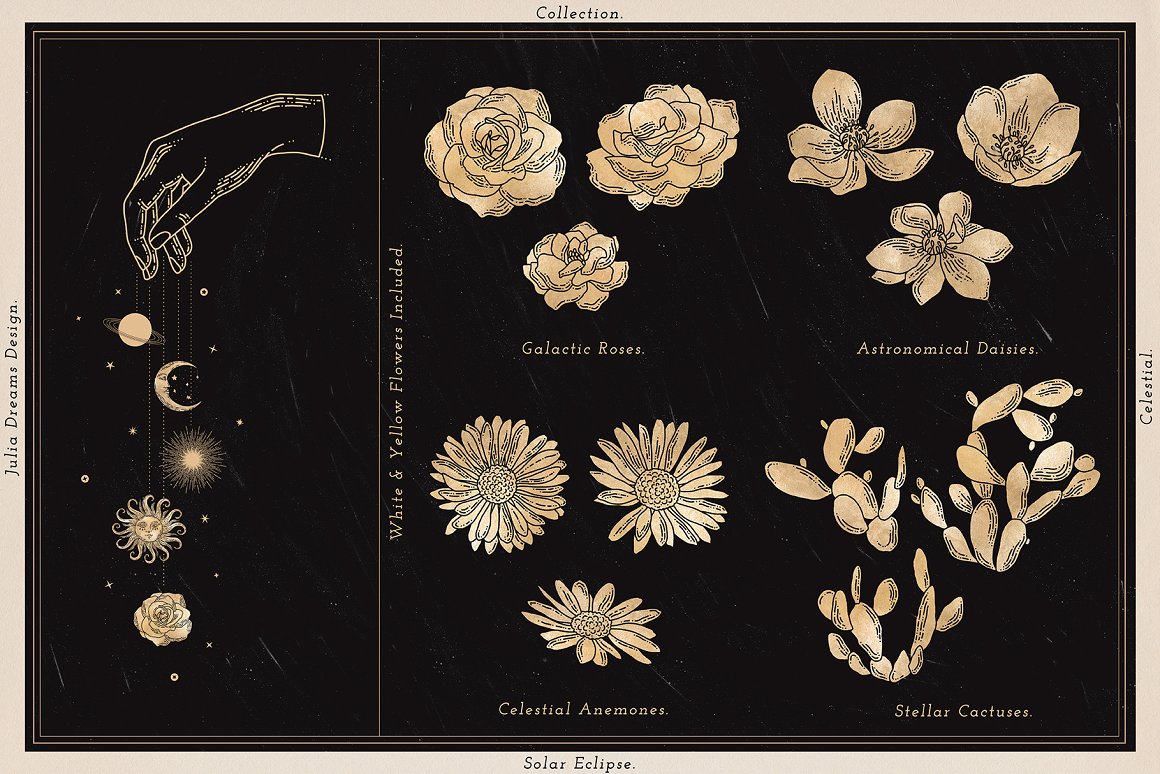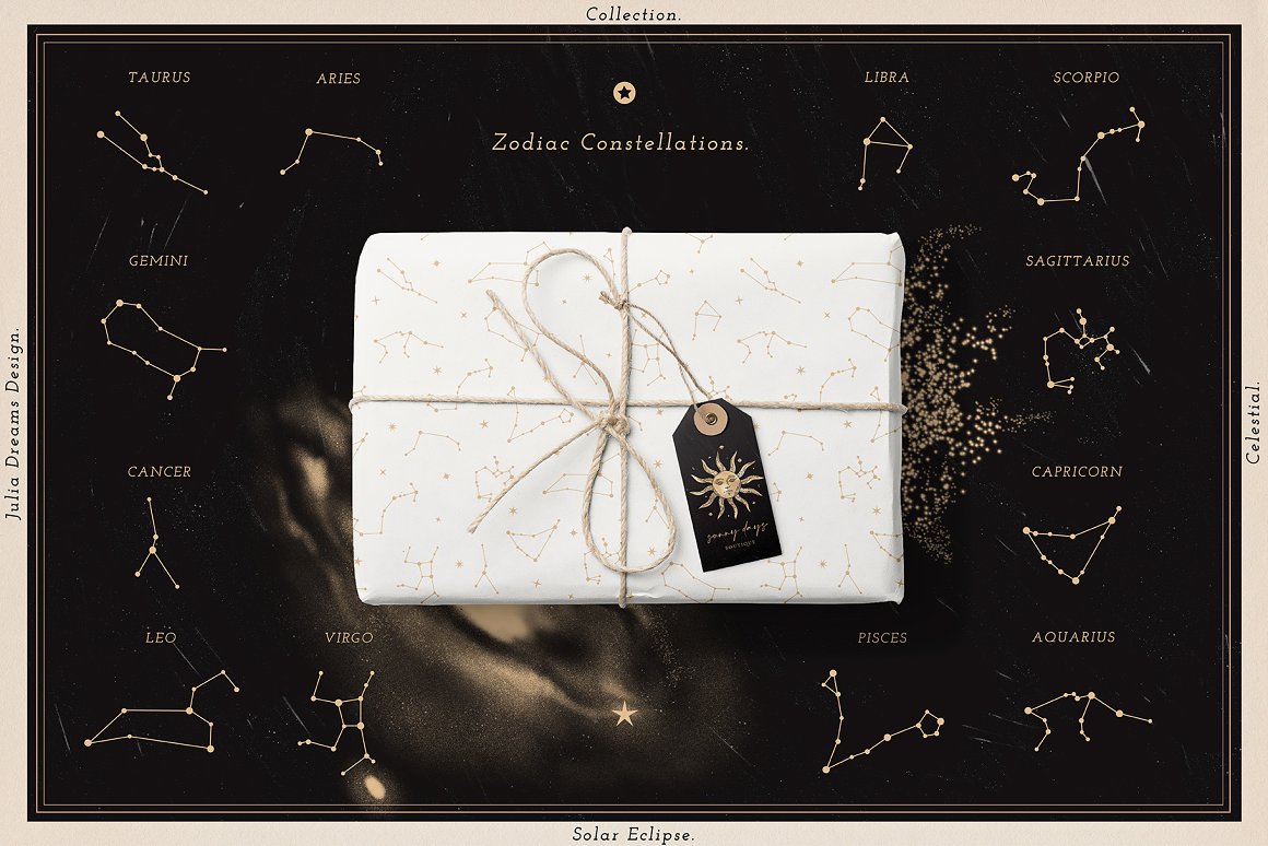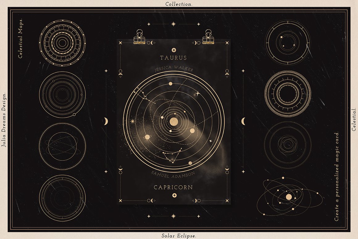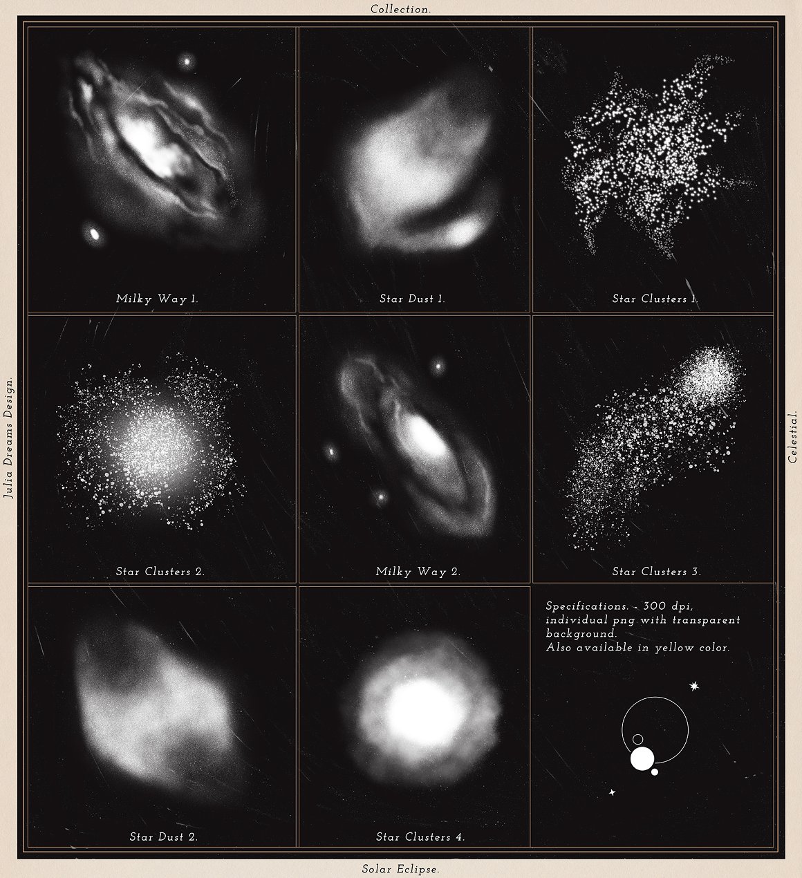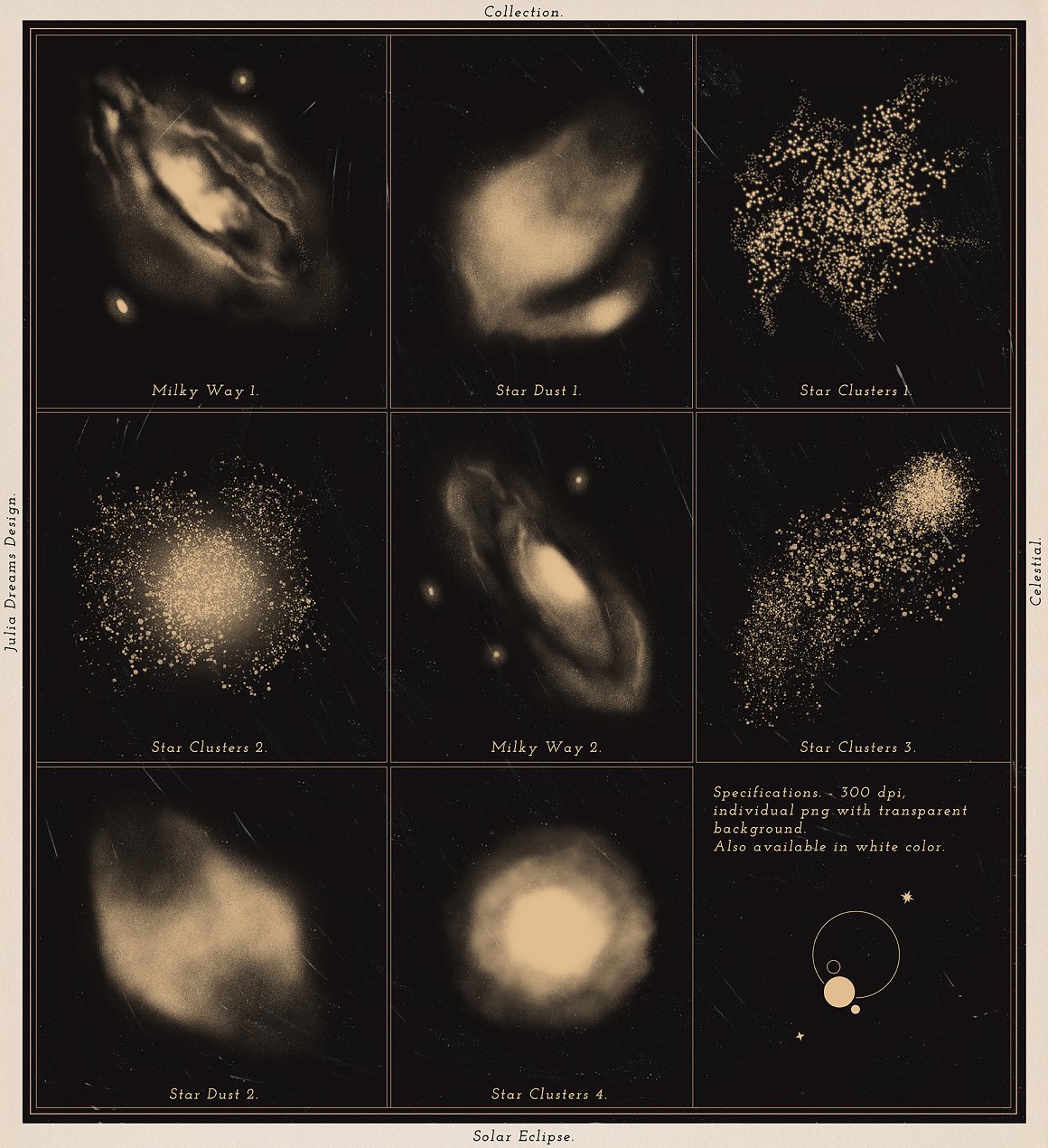 - 9 Celestial Maps – ai, eps and png [white, yellow, gold] with transparent background;