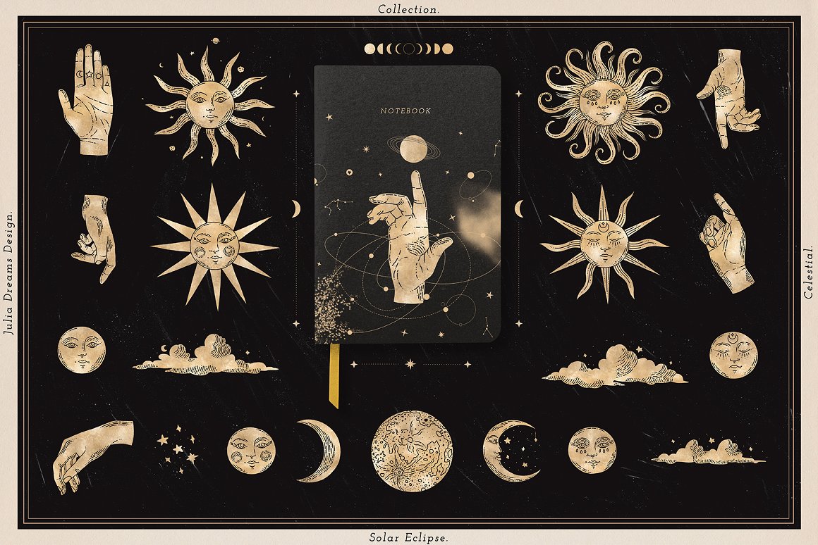 I’m so glad to introduce you my new celestial collection. It’s modern figures and lines with the shapes of the sun, moon, hands and stars. Hand painted with love elements can perfectly complement your project and help create a sophisticated, restrained and fashionable style. All these elements can make a special atmosphere in your project: from wedding to stationery branding, from logo to posters and postcards.