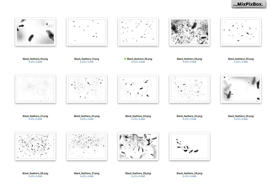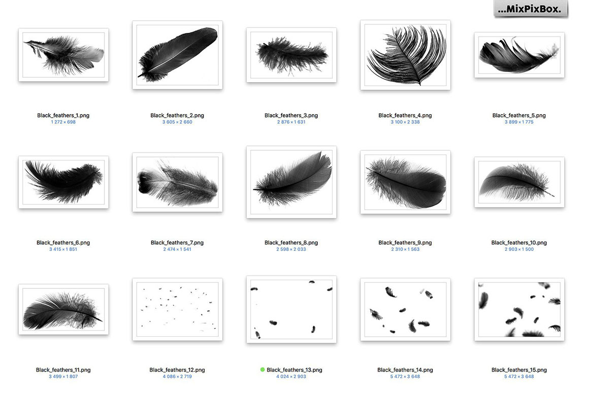 You get a total of 29 PNG-format overlays depicting floating black feathers which can be opened with most image editing programs. These black-swan feathers were photographed in high resolution during their fall to give you their shimmering vibration and a unique feather structure.