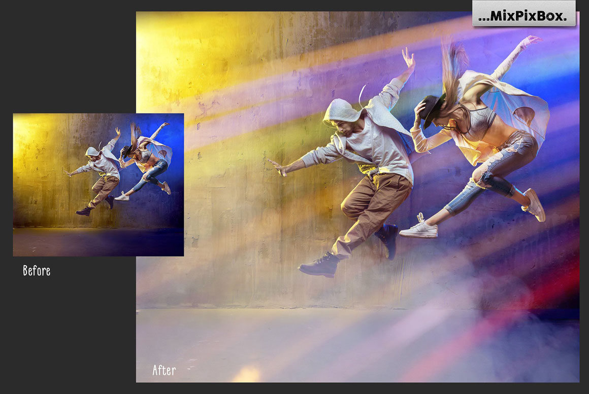 Add a noticeable plus to the atmosphere and create vivid scenes with these sparkling textures! Light, particles and fog are the recipe for a dense scenic setting. Depending on the subject and color choice, you’ll be able to create fascinating picture experiences that are illuminated by stage lights to make people true celebrities in your photos.