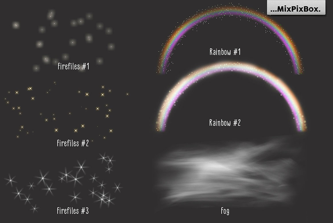 Should your fantasy picture be illuminated by fireflies? Would a magic rainbow add that crucial detail to your fairytale scene? The images in this package are just the right thing for such composing. Take a try and realize how easy it is to conjure the already cropped themes into your scenes! The pack includes 9 overlays of enchanting white unicorns; you also get 3 fireflies, 2 rainbow and 1 fog textures that magically make you play with light and shadow; finally, with 5 flower images, you add some colorful scenery in your pictures. Combine your composition with these matching glitter effects for the back and foreground.