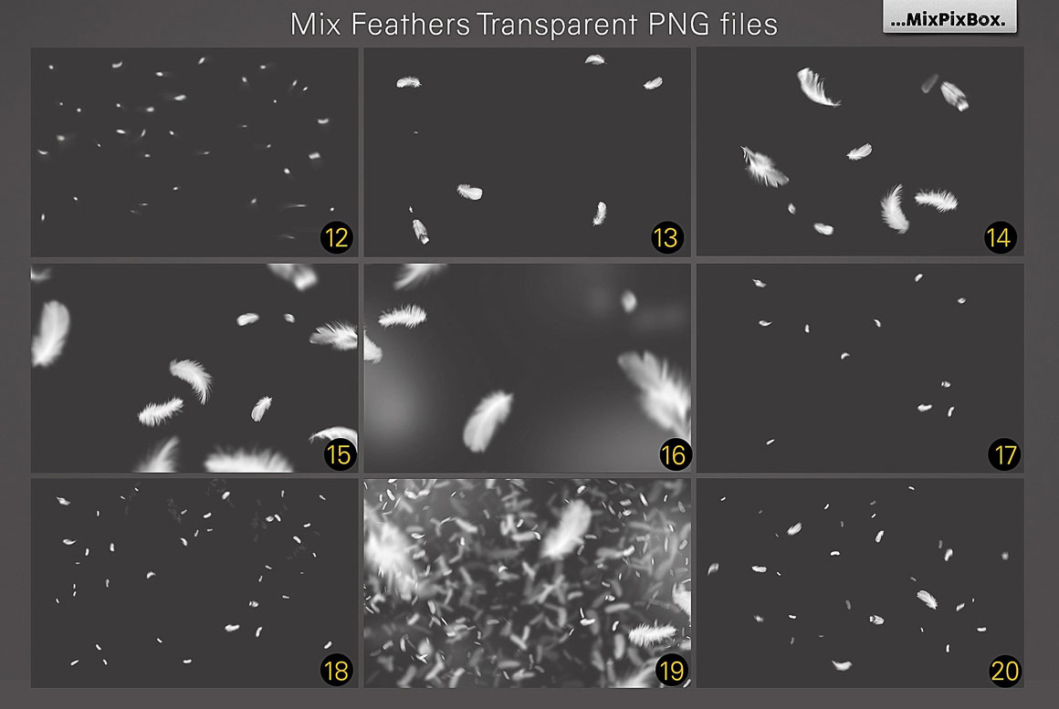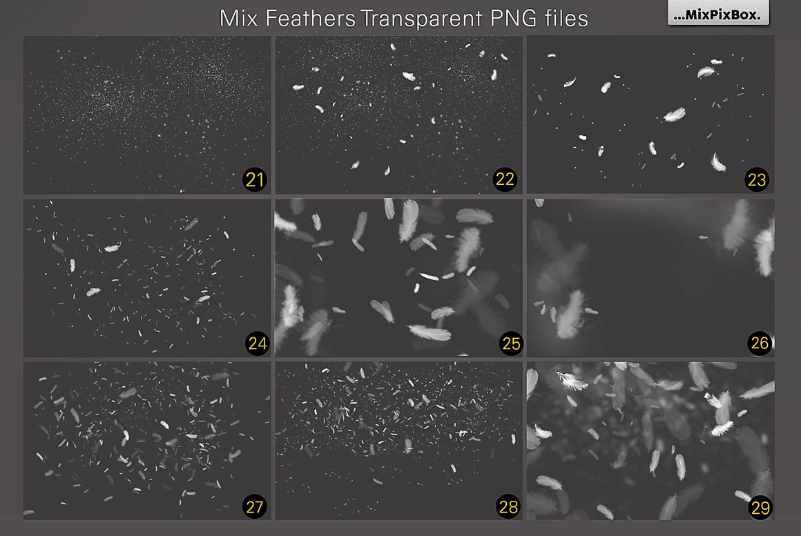 Give your compositions and photos a sense of lightness and weightlessness by using these 29 transparent overlays of falling feathers. To float in, you simply add fabulous white feathers to your works. Forget pillow shaking and goose plucking forever! To make feathers float through your works, you only need these overlays and a few clicks. Let your photos soar!
