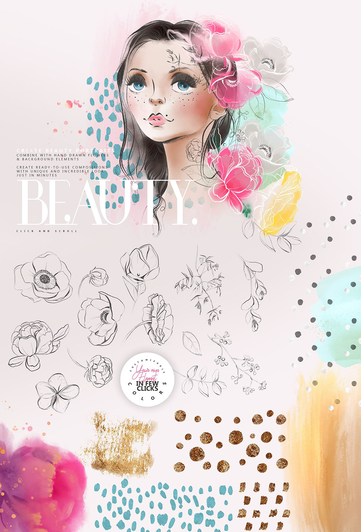 Start with four different portraits – change colors – such a make up, hair color (even ombre!), skintone, eyes color, facial details, add beautiful flowers and artistic brush stroke and your unique ready to use beauty portrait is done. Combine your portraits with abstract artistic background elements and modern lineart florals, create unique compositions with incredible look just in minutes.