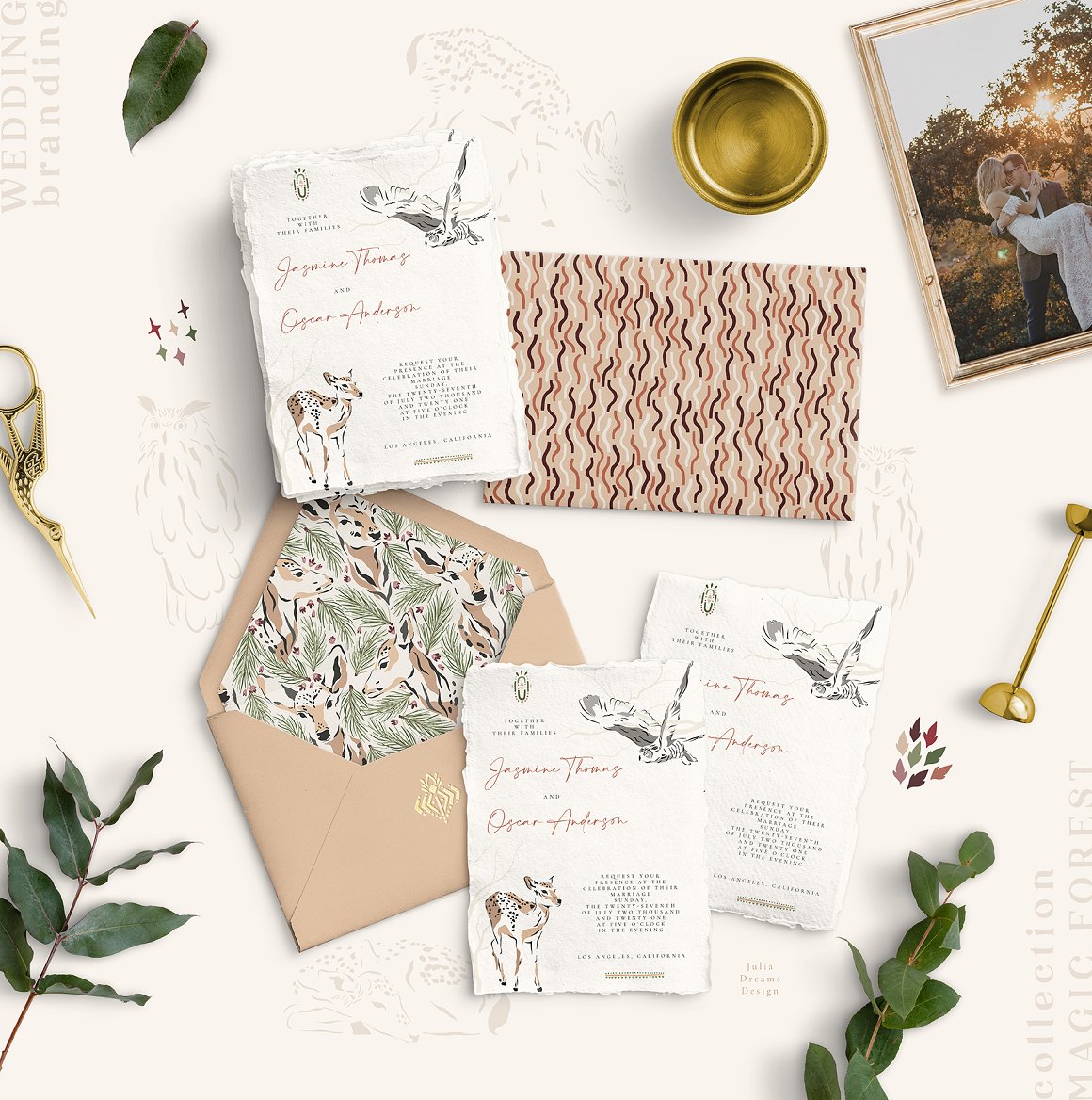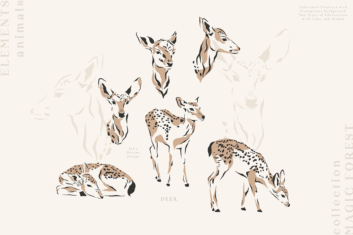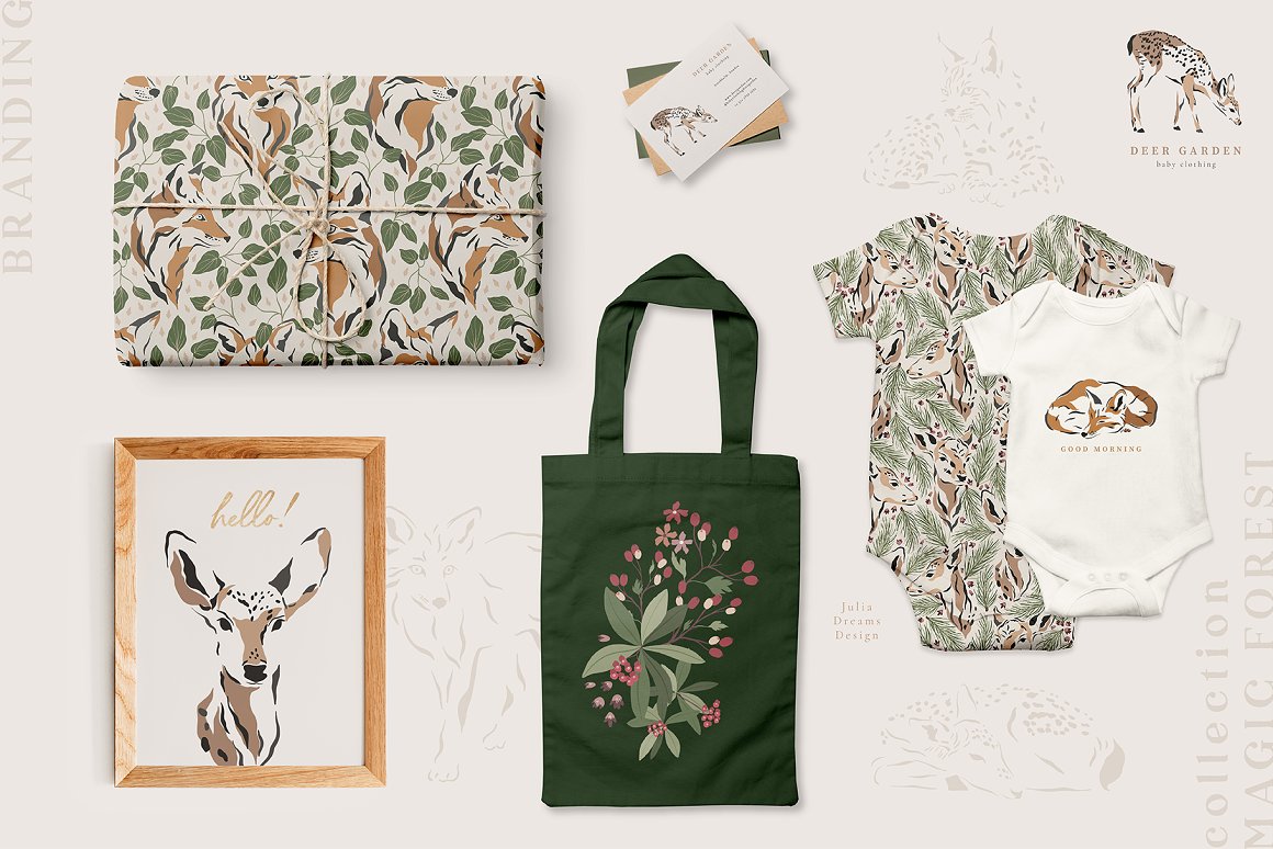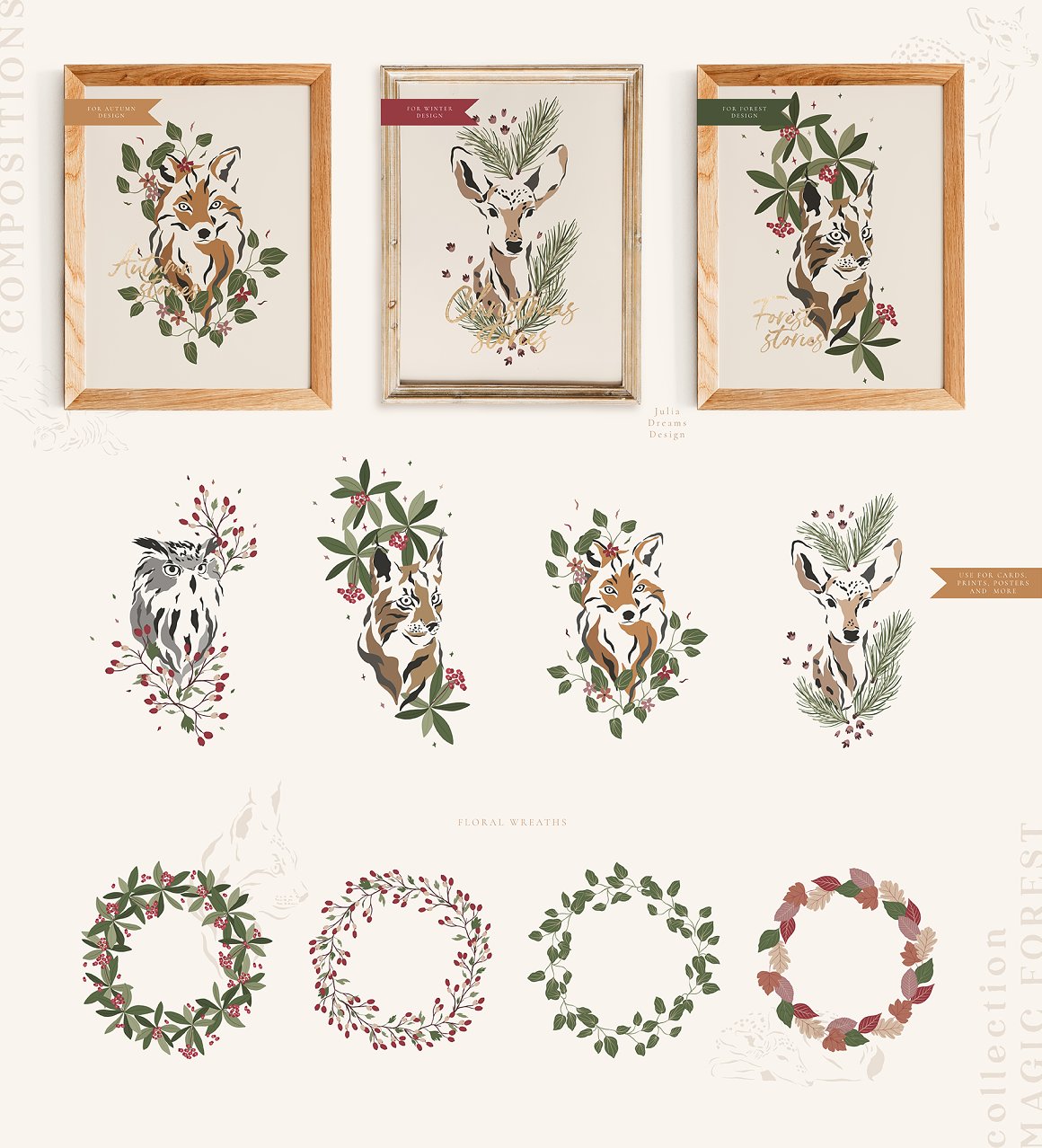 Magic & Forest Festive time! Illustrative and realistic animals create a fashionable, delicate and at the same time restrained style for your project. This is a great addition to create christmas cards, wedding branding, stationery, greeting card, photo frames and other beautiful things. Just add ready-made graphics: patterns and compositions. But also a big variety of individual elements: illustrations, decorative and floral elements. These graphics are ideal for the creation of the corporate identity of your shop or your small store. Or if you suddenly need to decorate your room or create a wedding invitation. Add this beautiful hand painted elements and florals to create a postcard.