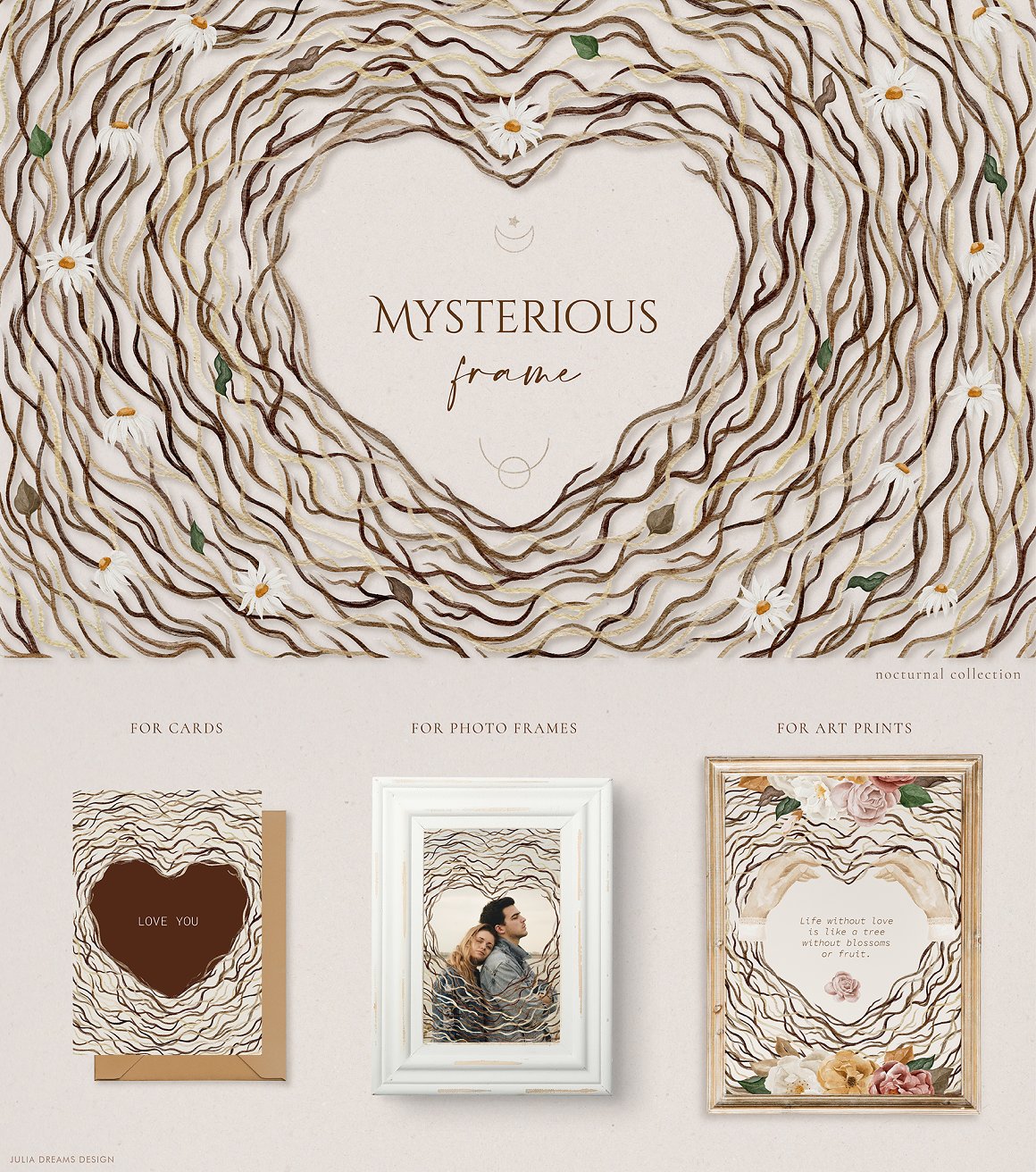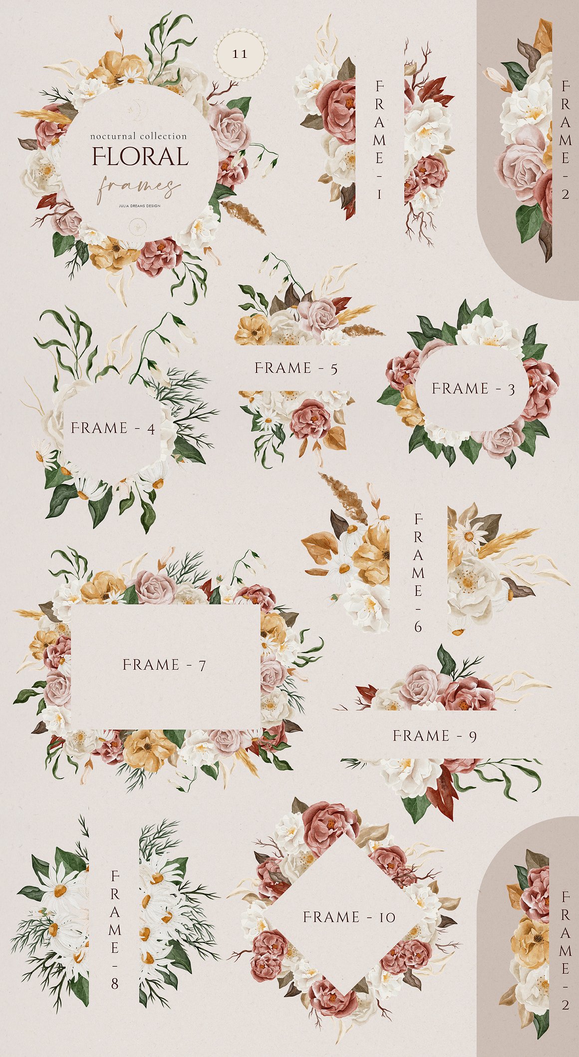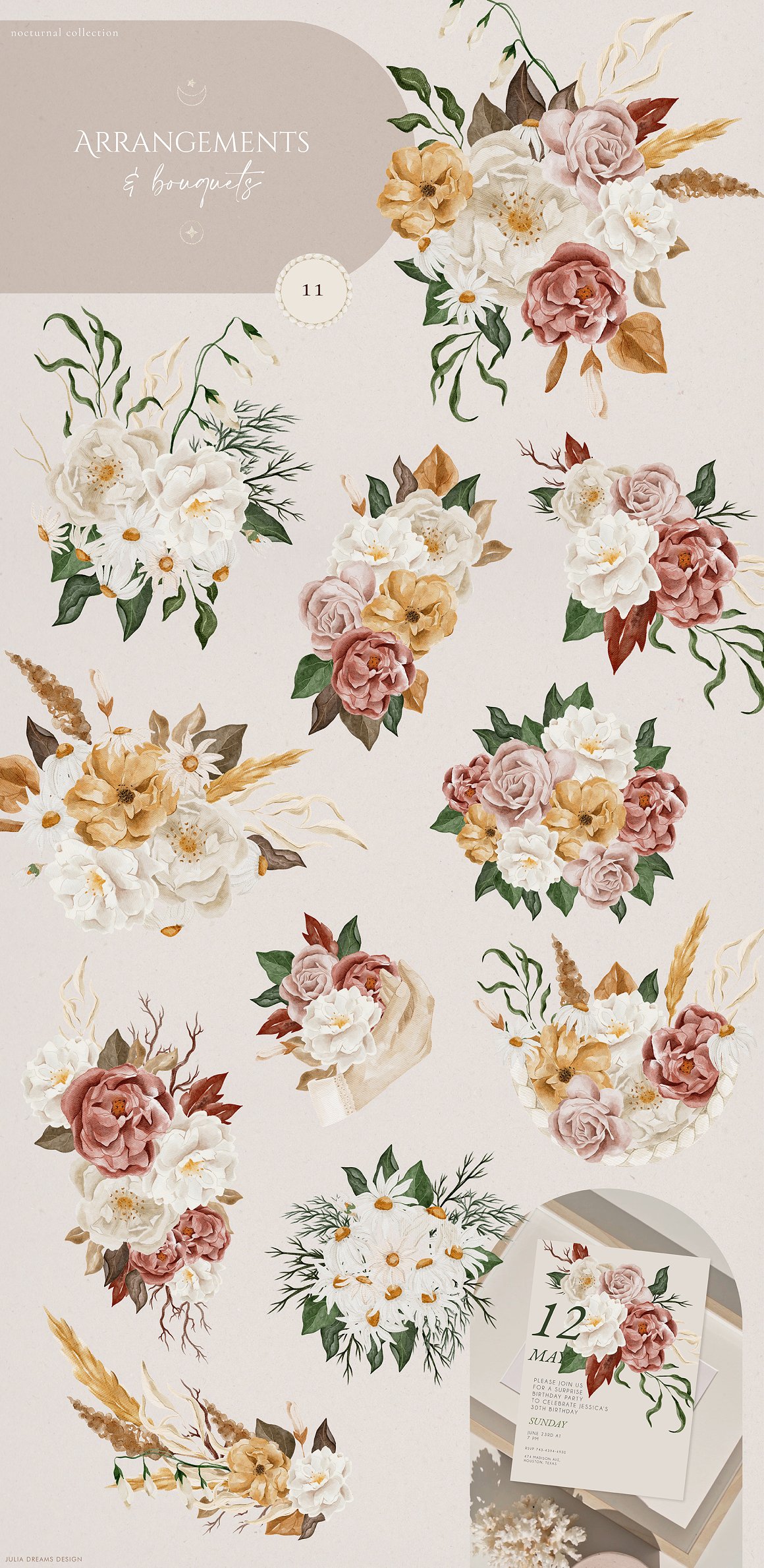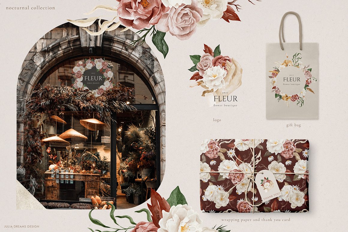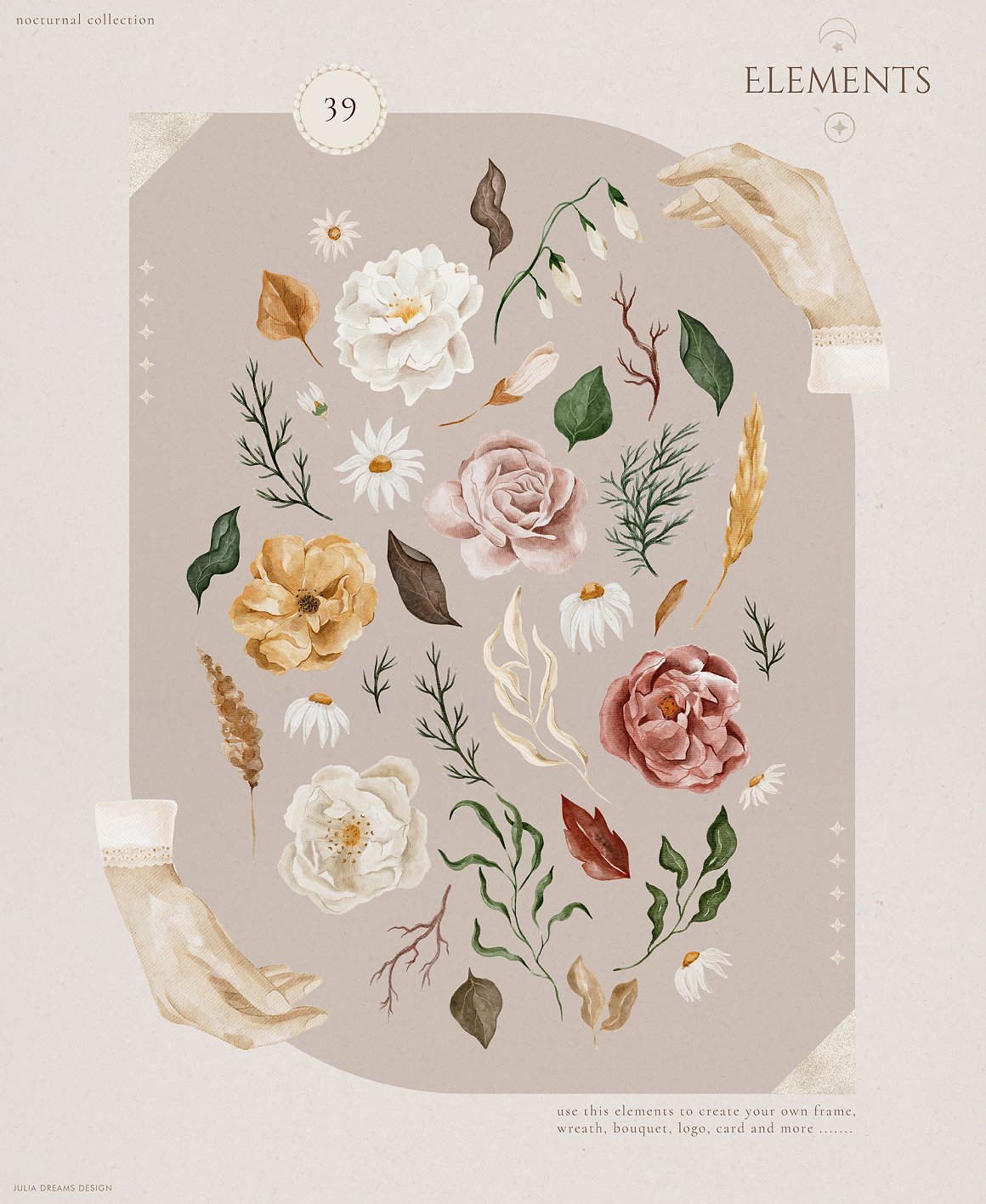 Mysterious and Magical, Nocturnal and Autumn. It’s all about new watercolor collection. This is a great addition to create wedding branding, stationery, greeting card, photo frames and other beautiful things. Just add ready-made graphics: patterns and compositions. But also a big variety of individual elements: watercolor flowers, decorative and floral elements. These graphics are ideal for the creation of the corporate identity of your shop or your small store. Or if you suddenly need to decorate your room or create a wedding invitation. Add this beautiful hand painted elements and florals to create a postcard.