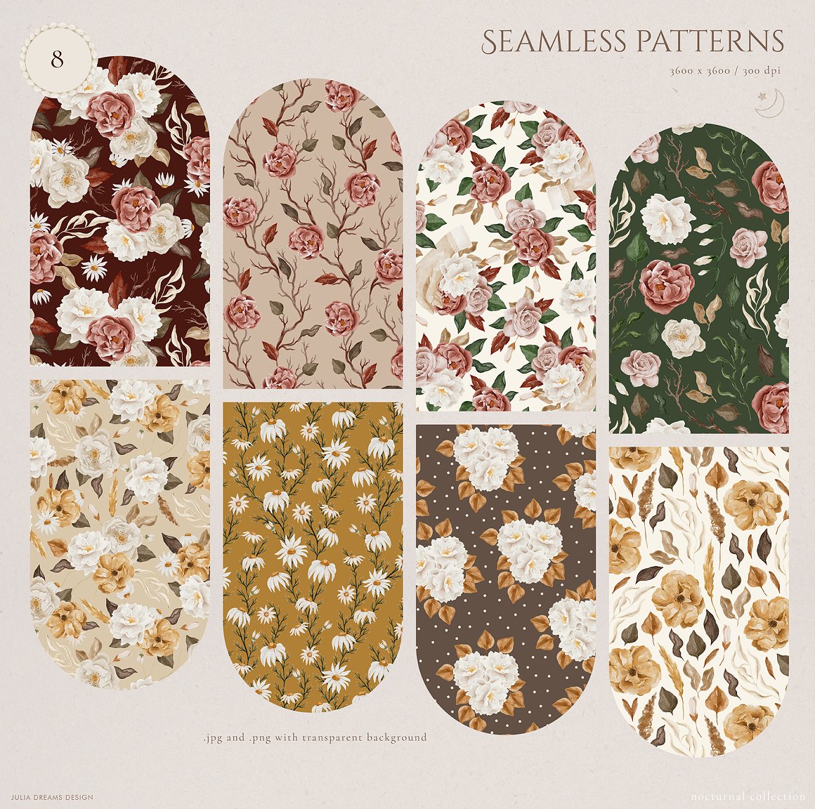 - 8 seamless patterns – jpg and png with transparent background;