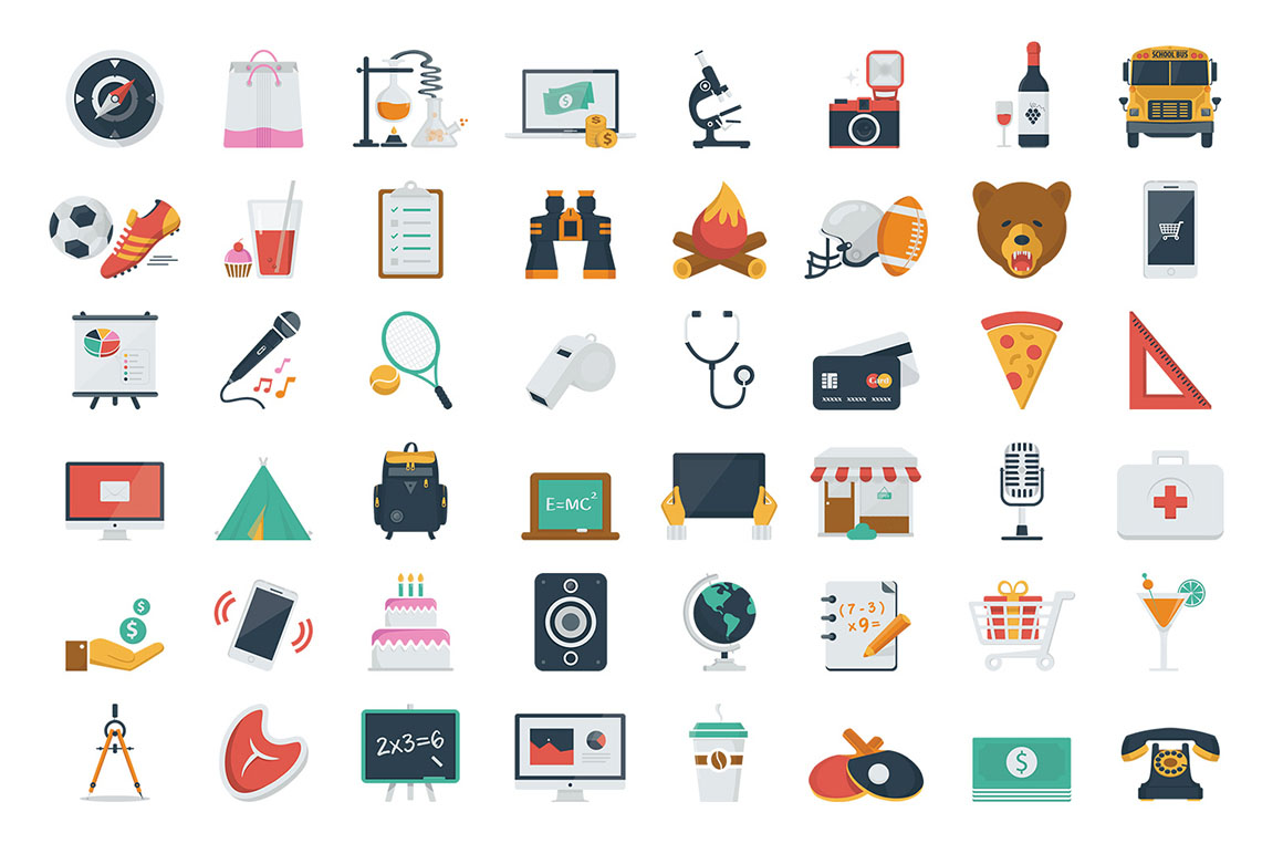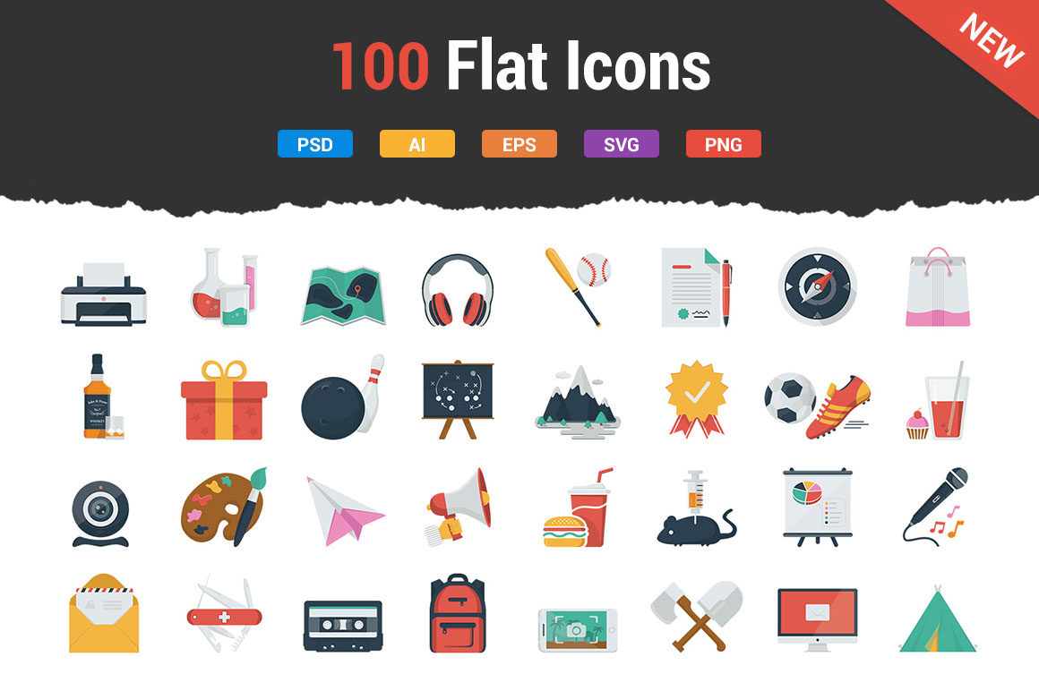 Awesome set of 100 flat icons. They are definitely perfect to add value to all your new projects and make them stand out! Created with love, this set is well organized into 10 different categories: Business, Communication, Shopping, Education, Devices, Health / Chemistry, Music / Audio, Camping, Sport, Food & Drinks. Icons are 100% vector and available in different formats: ai, eps, psd, svg and png.