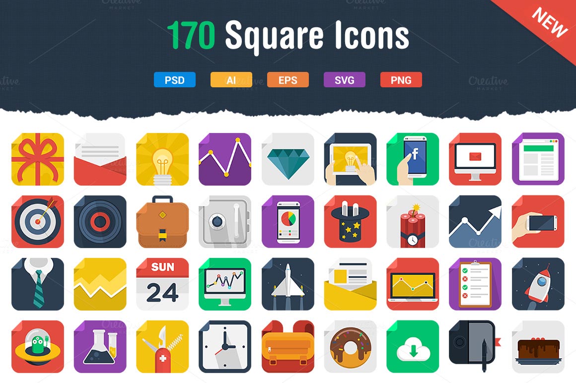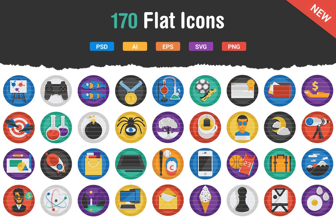 Another great (and modern) set of 170 Flat Icons. You will definitely need them to make your creations/projects stand out and… impress your customers! Created with love, these 170 icons are well organized into 5 different sets. Icons are 100% vector and available in different formats: ai, eps, psd, svg and png.