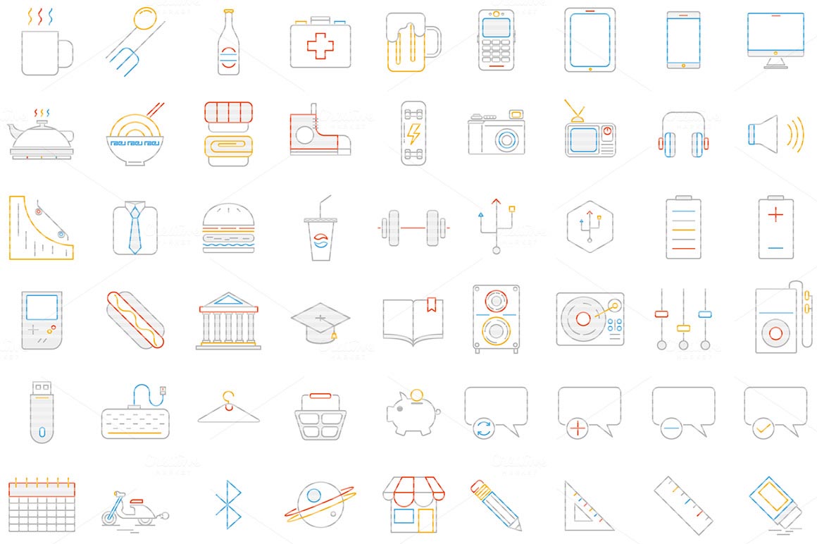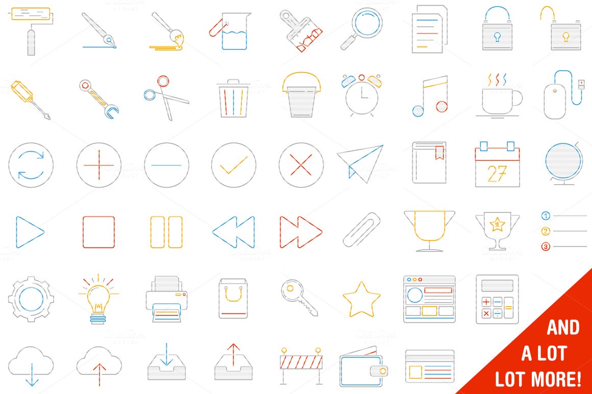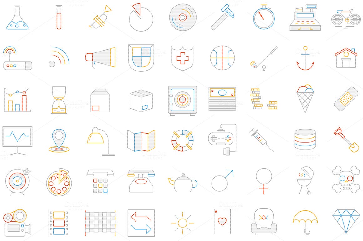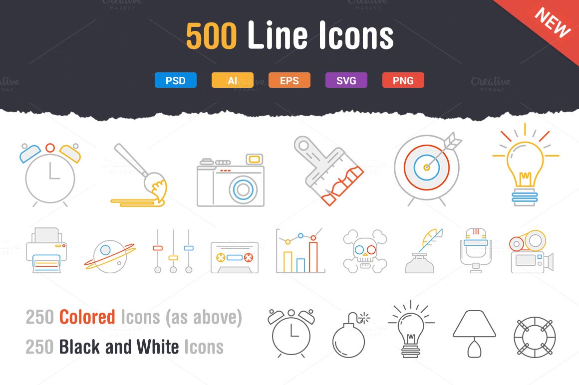 Outstanding set of 500 line icons, including 250 colored icons and 250 black & white icons! This set is really original and will be perfect if you want to give an elegant touch to your new projects. There is no way you won’t love this set! Seriously! Icons are 100% vector and available in different formats: ai, eps, psd, svg and png.