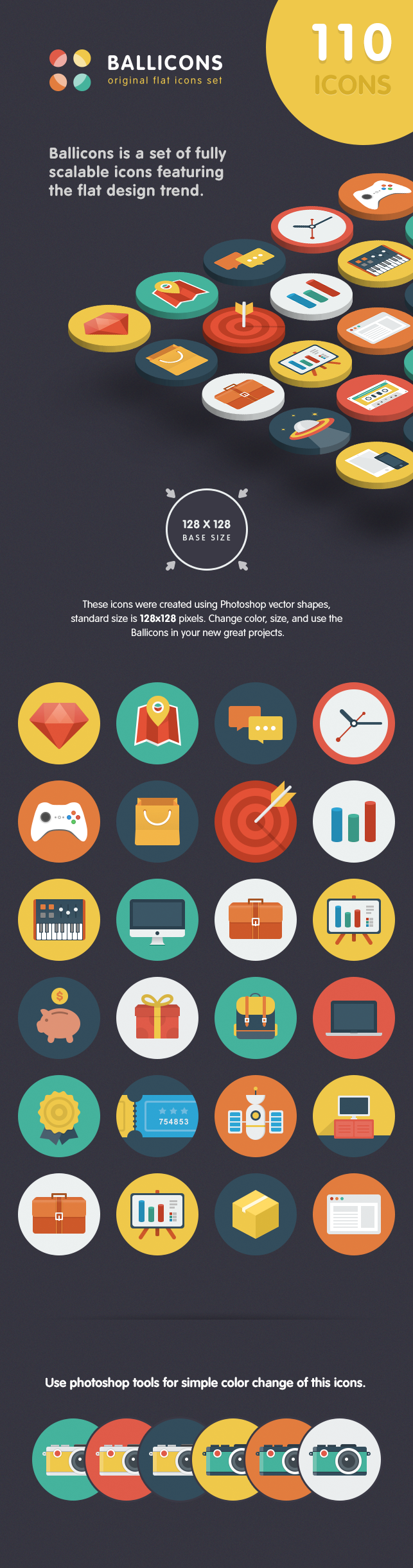 Ballicons is a colorful set of icons featuring the flat design trend. I hope you enjoy this product and will create some great projects using it. In set you will find 110 icons (on this moment) in PSD (normal size and @2x), SVG and PNG (normal size and @2x) formats. All layers created using Photoshop vector shapes.