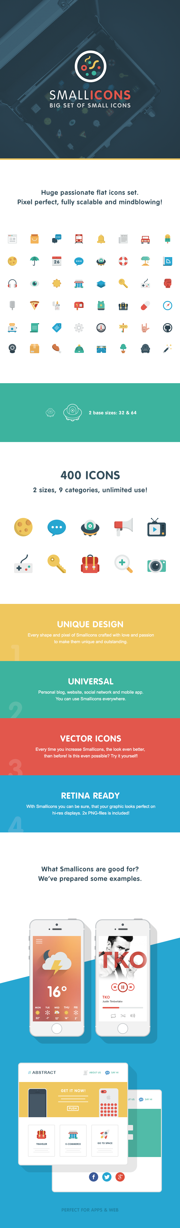 Beautiful icons are perfect for every area of design: apps, web interfaces, illustrations and animation. What is included 400 unique flat vector based icons, ready to use and customize.!