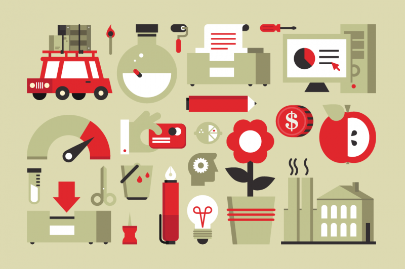 A collection of illustrations, vector elements from a wide variety of areas, 140 in total, designed with a stylish retro blocky look, usable on any kind of media and completely scalable. The following vector formats available: AI, EPS, PDF and AI Legacy. Pack contains 4 different color schemes.