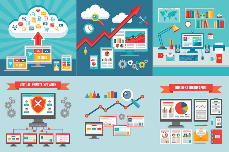 6 concept illustration in flat design style for presentation, booklet, web page etc. 1. Responsive adaptive web design – clouds concept illustration. 2. Business trend infographic – concept illustration. 3. Business office – workplace illustration. 4. Virtual private network – concept illustration. 5. SEO (Search Engine Optimization) – concept graphic illustration. 6. Business infographics on devices and documents. 100% vector! Zip file contain: EPS 8, JPG.