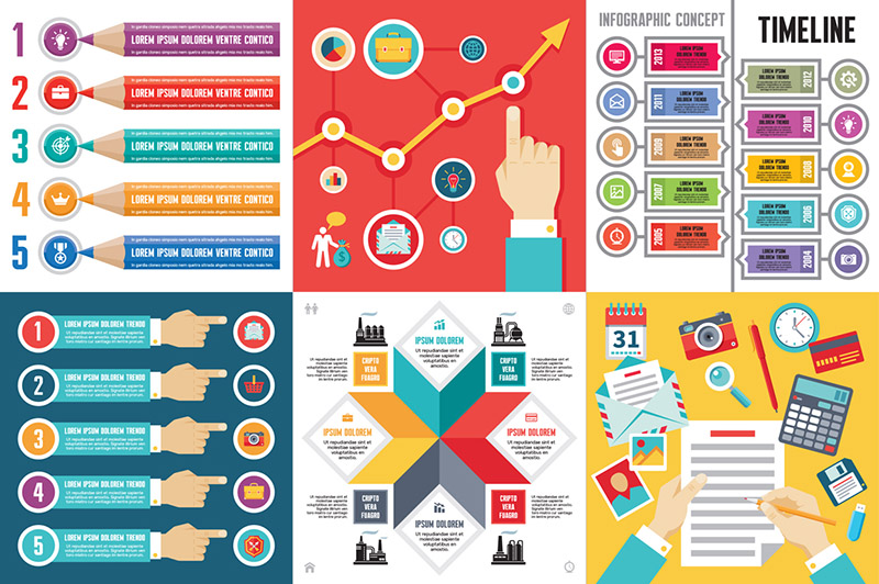 6 vector conceptual compositions of infographics: Colored pencils, Schedule and hand, Timeline concept, Numbered options with hands, Abstract infographic with factory icons, Concept Illustration in flat design style. 100% vector! Zip file contain: EPS SC3, JPG, TTF.