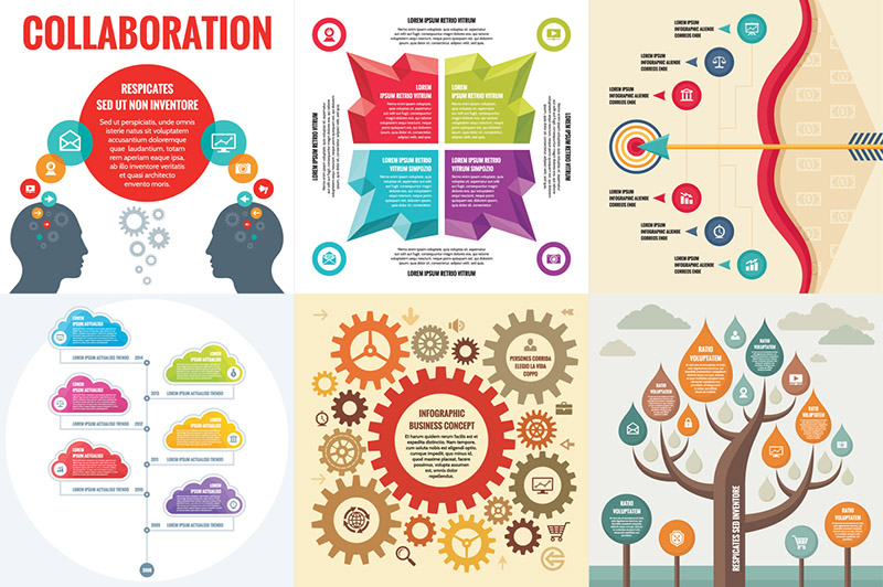 6 infographic vector concept for creative business presentation, booklet, website. 1. Collaboration business concept with human heads. 2. Infographic concept – abstract geometric forms. 3. Infographic concept illustration with bow, arrow and target. 4. Infographic concept of timeline with colored clouds. 5. Infographic business concept with gears and icons. 6. Infographic business concept – tree design illustration. 100% vector! Zip file contain: EPS SC3 (CMYK, text and curves), JPG.