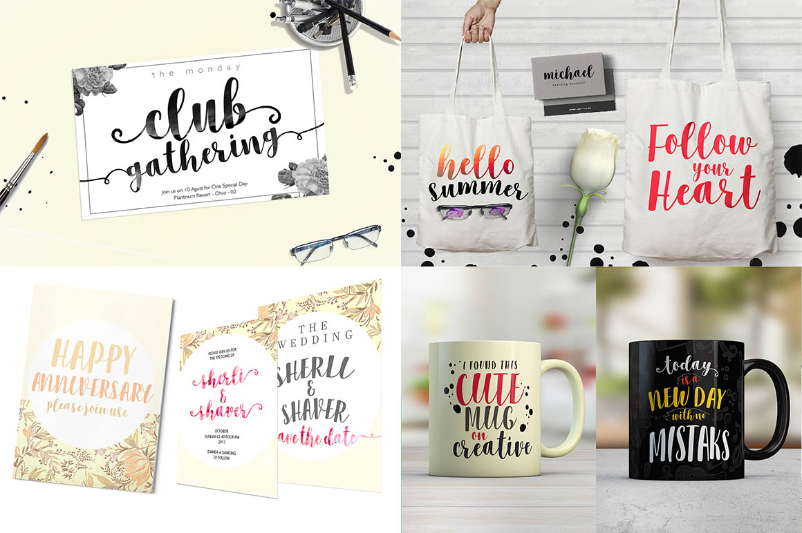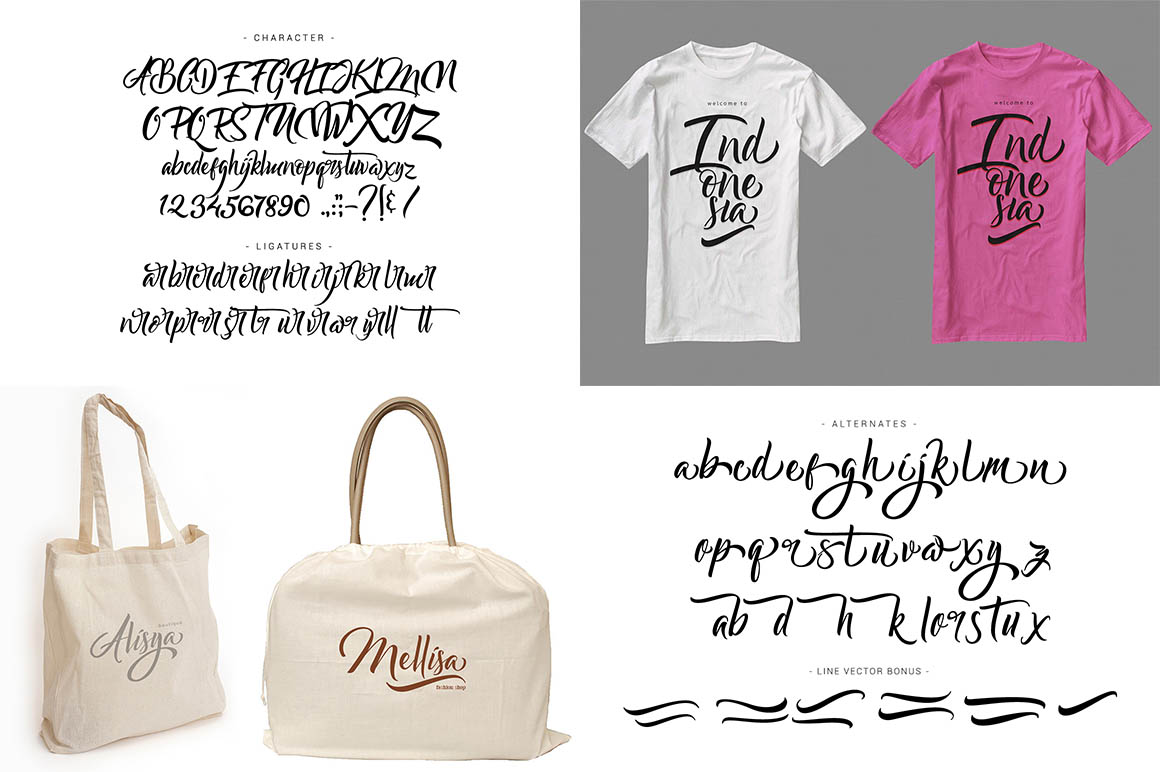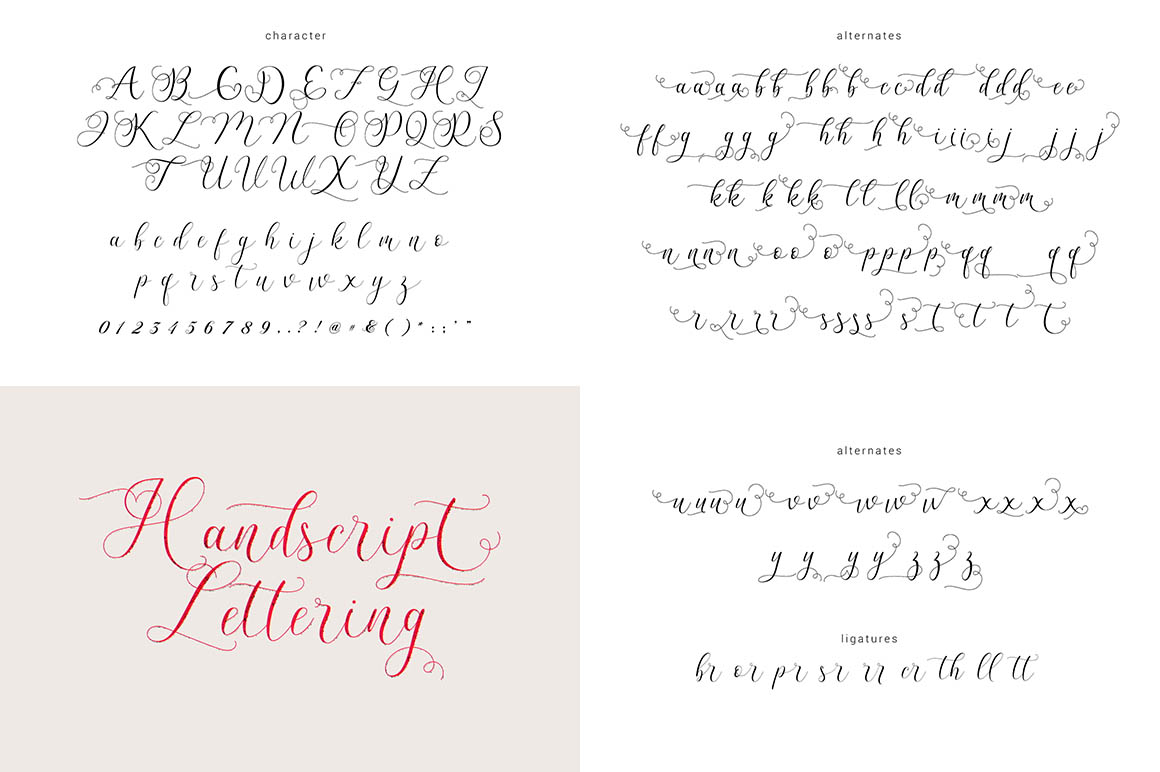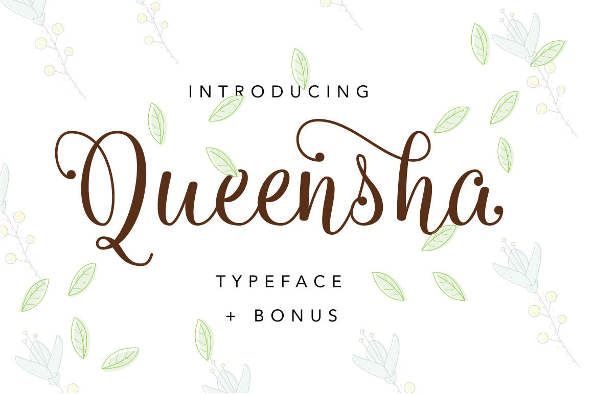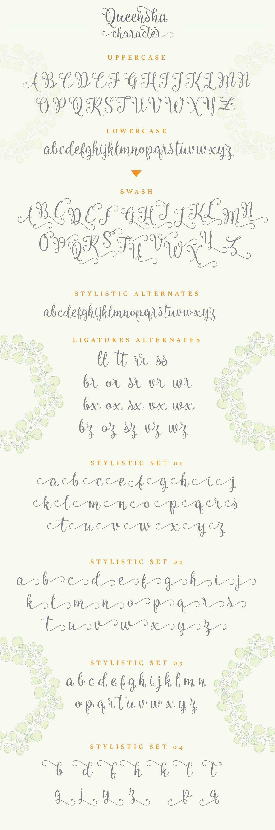Queensha Typeface is a new Modern Calligraphy Typeface Fonts collection from Ianmikraz studio, combines from copperplate to contemporary typeface, classic, beauty and elegant touch. Queensha Typeface features 350 glyphs and 161 alternate character contain with opentype features and has given PUA unicode (specially coded fonts), with tons of alternate characters. . Stylistic Alternates, Standart Ligature and more.You can access all those alternate characters by using OpenType savvy programs such as Adobe Illustrator, Adobe InDesign and CorelDraw X6-X7. For other programs that doesn’t support OpenType Features or Glyphs Panel such as Photoshop, you can use Character Map in Windows to access the alternate characters 🙂