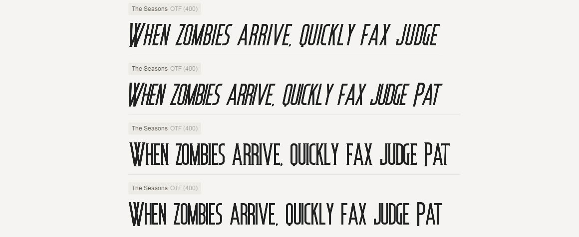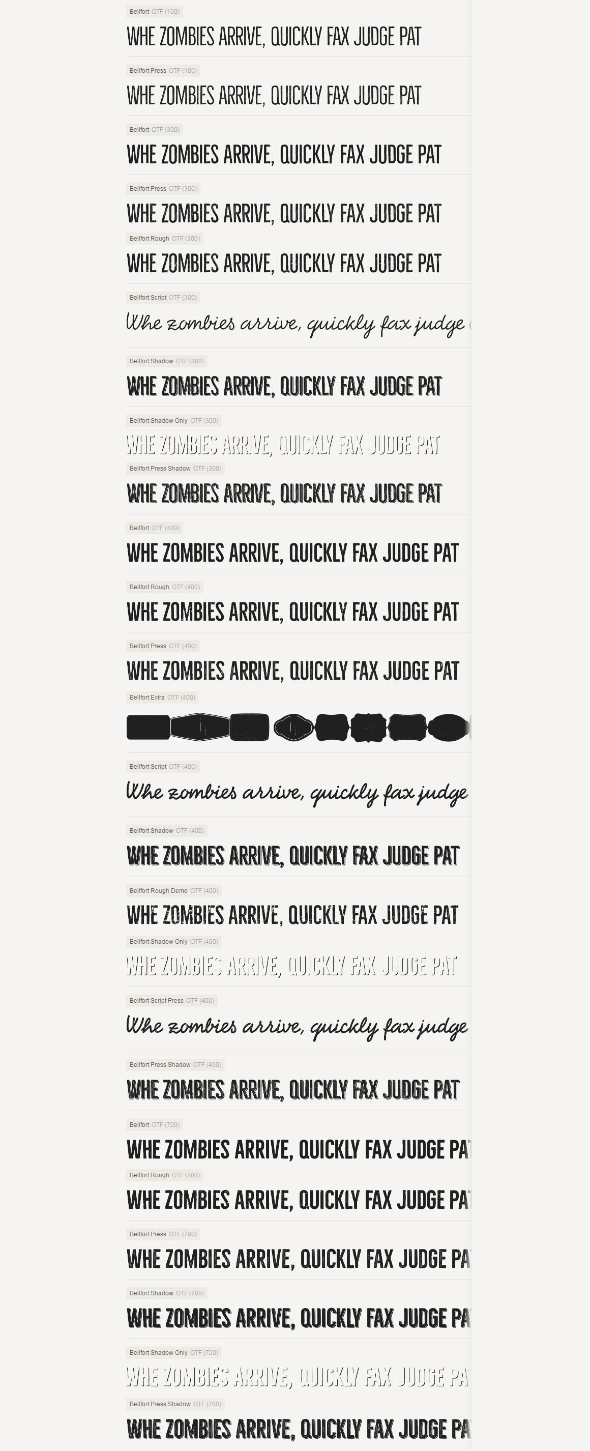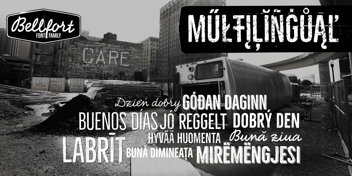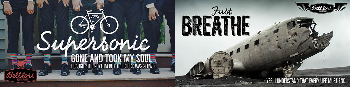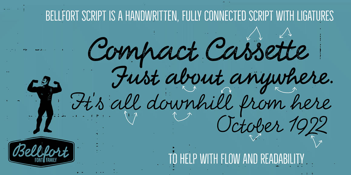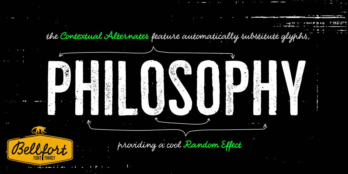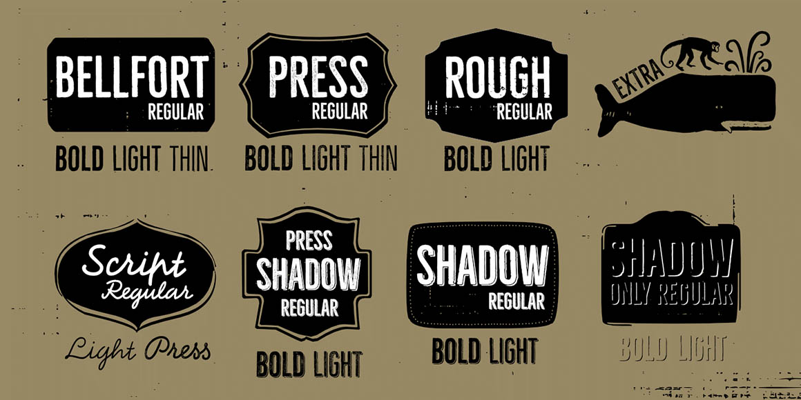 Bellfort family features 7 different sub-families: Regular, Rough, Press, Shadow, Press shadow, Shadow Only, Script. Each of these sub-families contains up to four font weights. When the font is used in OpenType-savvy applications, the 3 variants of glyphs are automatically alternated to achieve a random-like effect. When not using the Contextual Alternates feature, you can still pick the alternates in the Glyphs palette or use the alternates available from the keyboard upper and lower case. Bellfort Script is a handwritten, fully connected script with ligatures and contextual alternates to help with flow and readability. Language support includes Western, Central and Eastern European character sets, as well as Baltic and Turkish languages etc. Stylistic alternates for key lower case characters are also available, accessible in the Adobe Illustrator Glyphs panel, or under Stylistic Alternates in the Adobe Photoshop OpenType menu.
