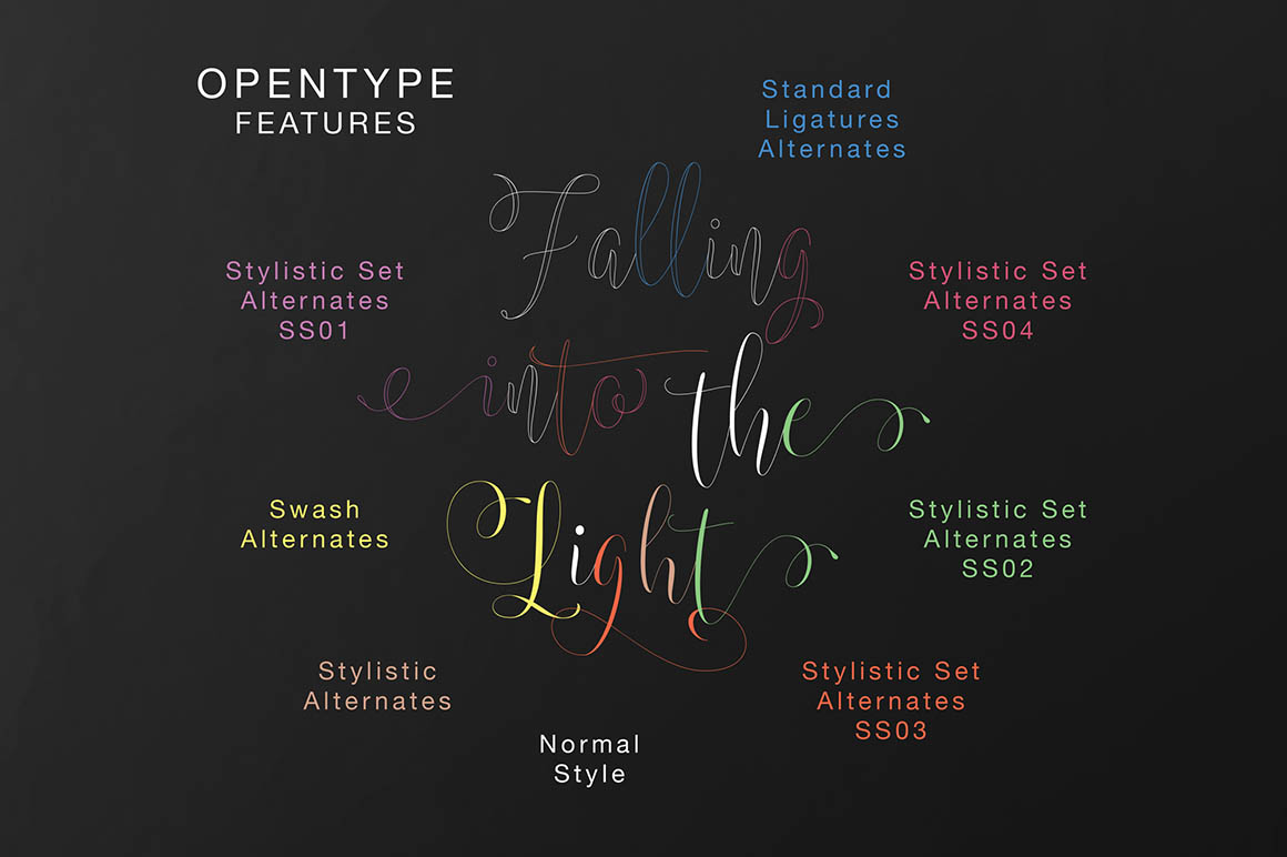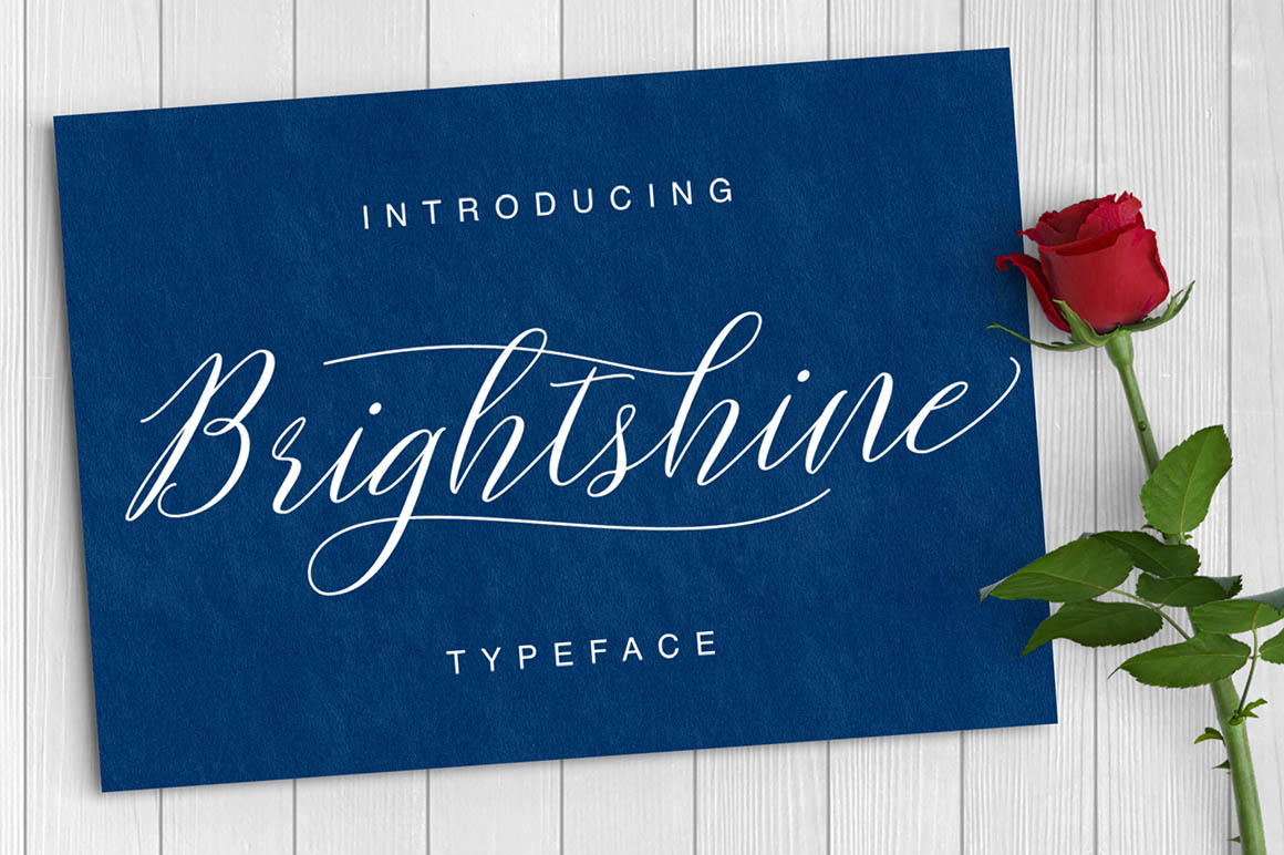 Brightshine Typeface is a new Modern Calligraphy Typeface Fonts collection from Ianmikraz studio, combines from copperplate to contemporary typeface, classic, beauty and elegant touch. Brightshine Typeface features 313 glyphs with alternate character contain with opentype features and has given PUA unicode (specially coded fonts), with tons of alternate characters. . Stylistic Alternates, Standart Ligature and more. You can access all those alternate characters by using OpenType savvy programs such as Adobe Illustrator, Adobe InDesign and CorelDraw X6-X7. For other programs that doesn’t support OpenType Features or Glyphs Panel such as Photoshop, you can use Character Map in Windows to access the alternate characters 🙂