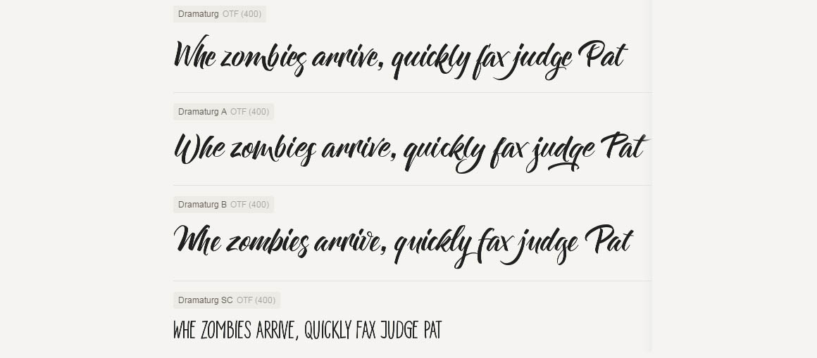 Dramaturg is a handwritten, brush, fully connected script with ligatures and contextual alternates to help with flow and readability. Dramaturg is the most complete style, it contains over 600 glyphs, 7 stylistic sets, contextual alternates and ligatures. Every lowercase letter has six variations (uppercase letter has four). When the font is used in OpenType-savvy applications, the 3 variants of glyphs are automatically alternated to achieve a random-like effect. Dramaturg A and Dramaturg B have less glyphs than the Regular one (no stylistic sets), they only contain some selected alternates and ligatures. Language support includes Western, Central and Eastern European character sets, as well as Baltic and Turkish languages.