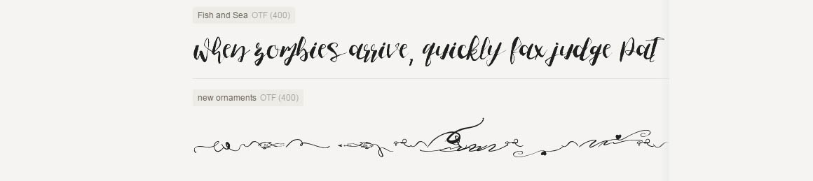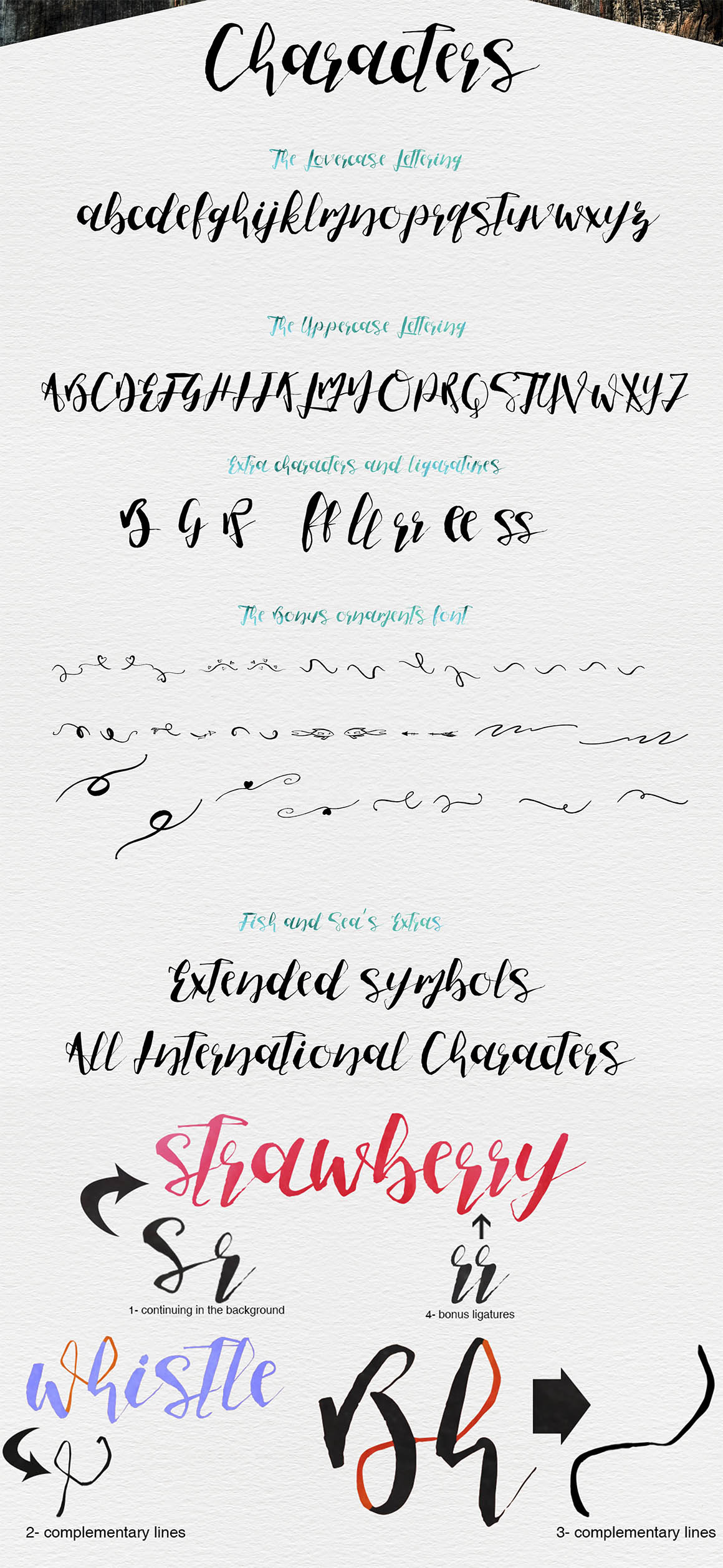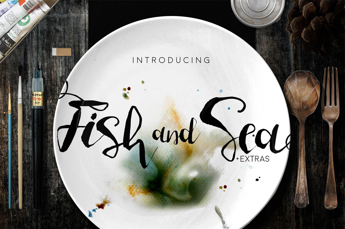 Introducing Fish and Sea Typeface +Extras . New hand lettering font Fish and Sea , comes with strong extras pack , innovation , loveliness and 35 ornaments font!!.. Connectable continuing lines will dazzle you. With more than 230 characters Fish and Sea is waiting for you ready to create your design.Also you can use ligatures.